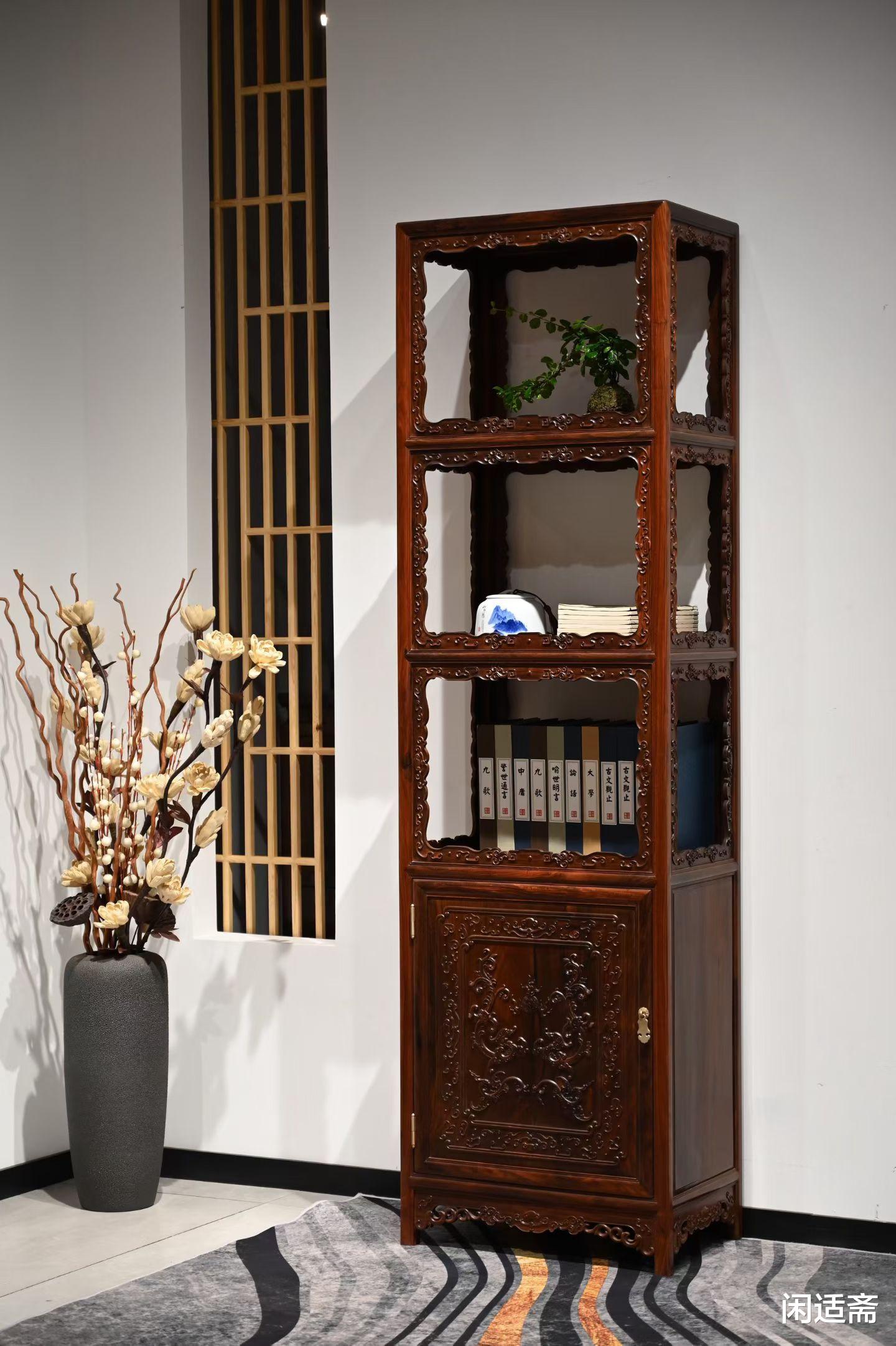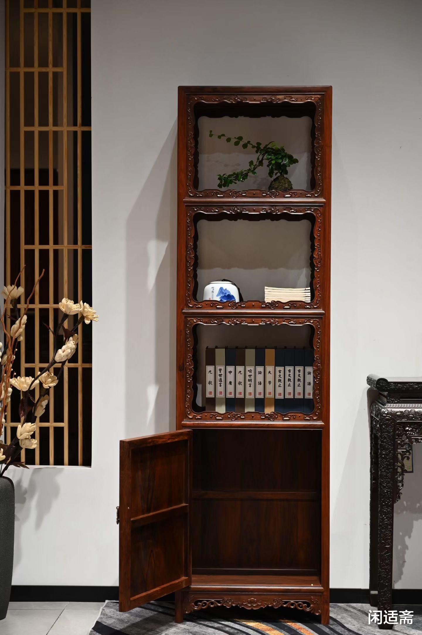 大红酸枝 三层带柜螭凤云纹博古书架