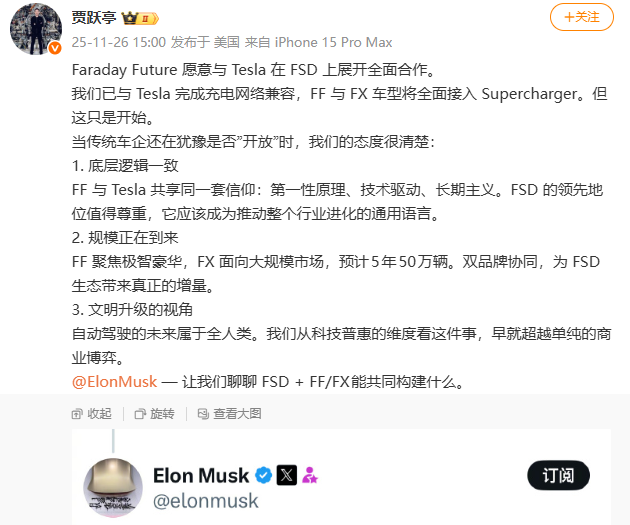 2025年11月26日消息,Faraday Future(FF)法拉第未来创始人、联席CEO贾跃亭在社交媒体发文称,愿意与特斯拉在FSD上展开全面合作,同时,他还对特斯拉CEO埃隆马斯克Elon Musk隔空喊话称,“让我们聊聊FSD+FF/FX能共同构建什么”。截至发稿,马斯克尚未对此作出回应。