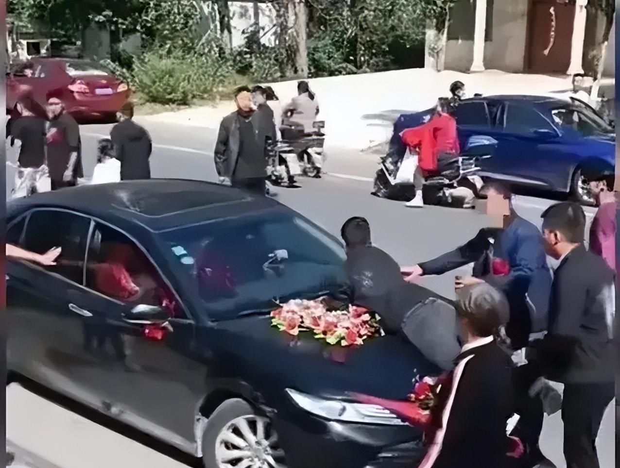婚车抵达新娘家门口时,新娘的哥哥直接挡在了车前,情绪激动,不允许婚车离开。