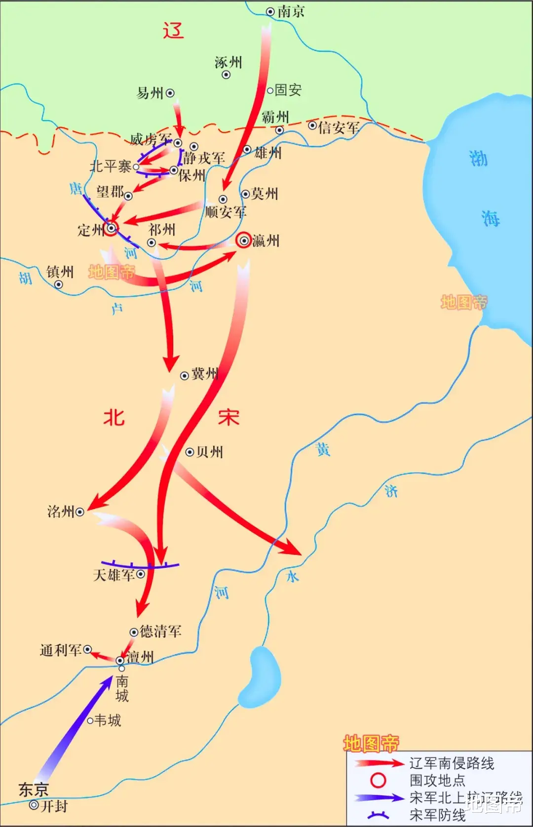 1005年(北宋真宗景德二年,辽圣宗统和二十三年),北宋与辽朝订立和约,互为兄弟之国,辽为兄,宋为弟。北宋每年给辽岁币银10万两、绢20万匹,双方以白沟河为边界。因澶州(河南濮阳)在宋朝亦称澶渊郡,史称澶渊之盟。