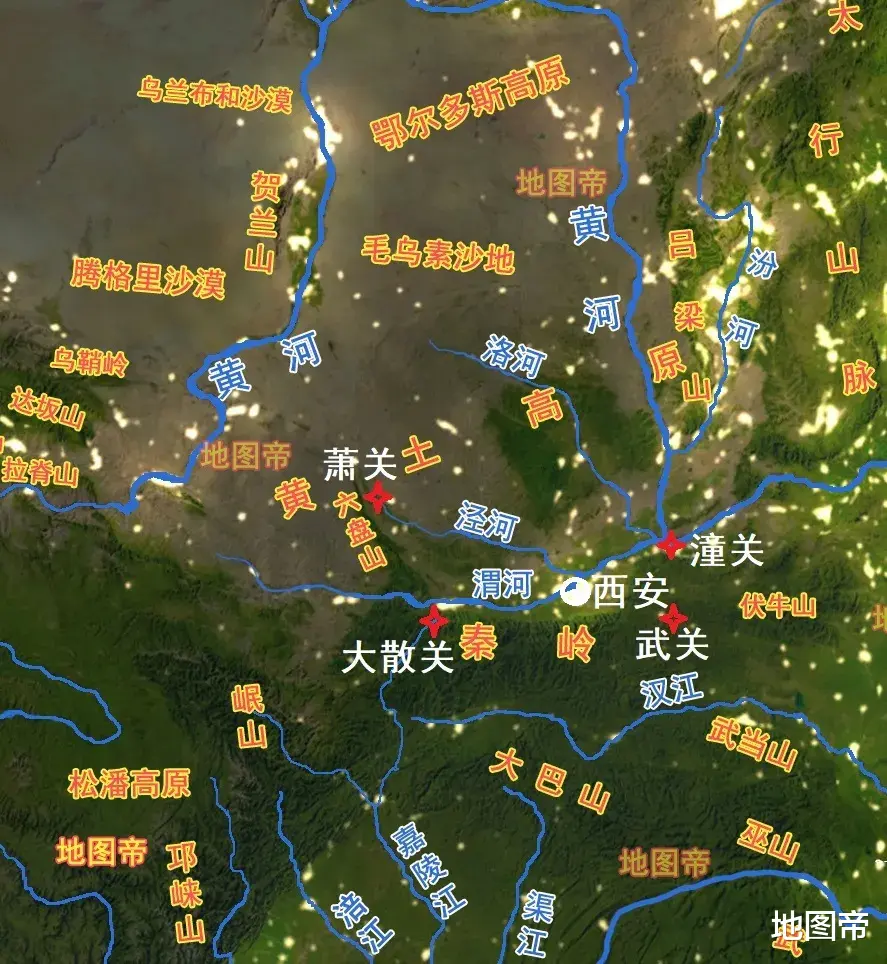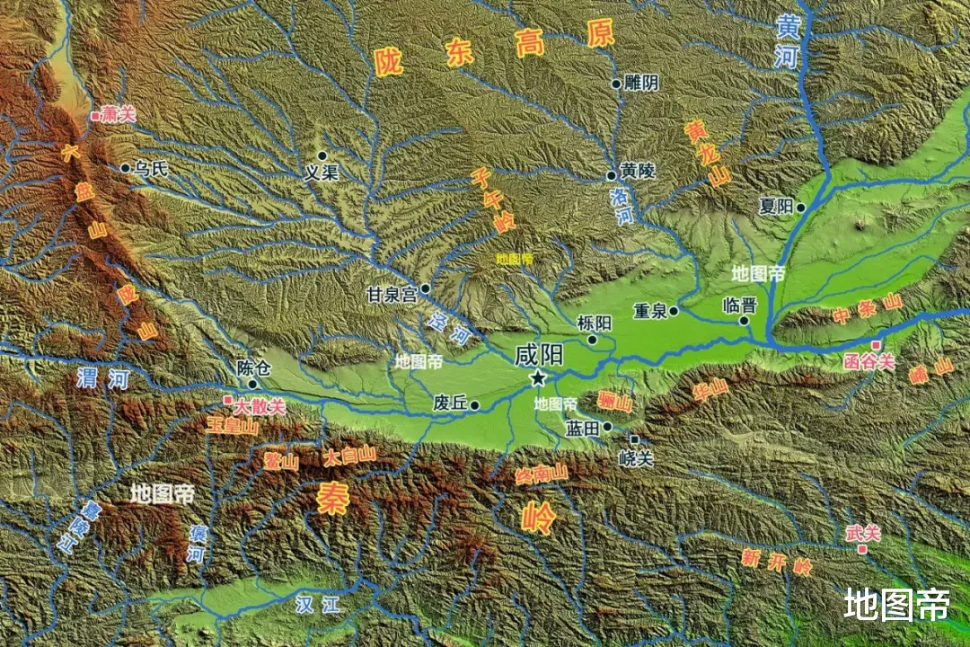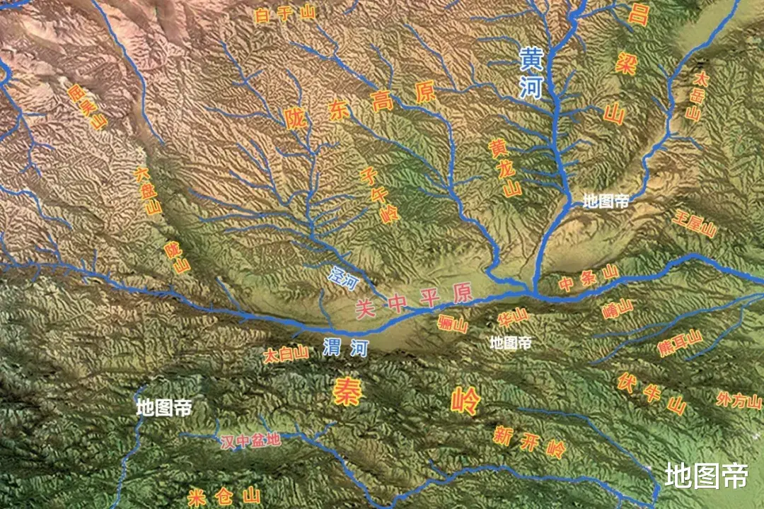 关中,西起宝鸡,东至三门峡,南接秦岭,北临黄土高原,东西长达三百千米。关中腹地为渭河、泾河、北洛河三河形成的冲积平原,号称“八百里秦川”。三河及其支流纵横分布,土地肥沃,灌溉便利,农业发达。