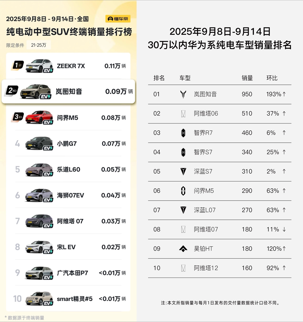 当全新岚图知音跻身9月8日-9月14日30万内华系纯电TOP1、纯电动中型SUV终端销量TOP2,极氪持续收割高性能纯电市场,问界、阿维塔、智界等产品纷纷崭露头角,一个清晰的信号正在浮现: 中国新能源市场的竞争主线,正从“新势力领跑”全面进入“传统巨头反超”的新阶段。