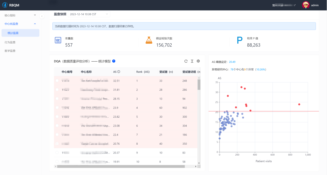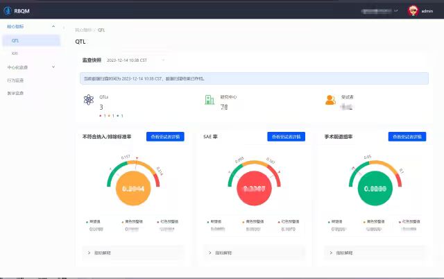 EDC ( 电子数据采集) 数据、 系统生成的稽查轨迹( Audit Trail ) 以及质疑数据(Query) 等多源异构数据, 经过ETL处理后被喂给后台的统计引擎和机器学习模型。 系统会实时计算每个中心的“异常评分” 。 在KRI仪表盘上, 所有研究中心被映射为气泡图上的点, 颜色深浅代表风险等级。