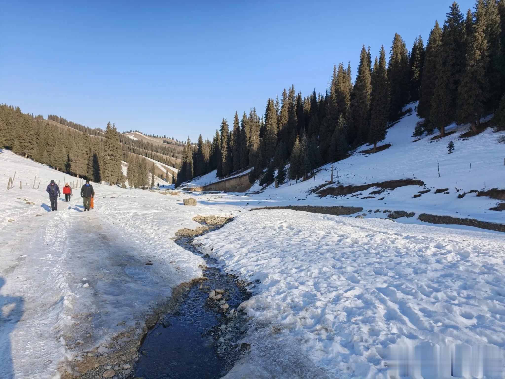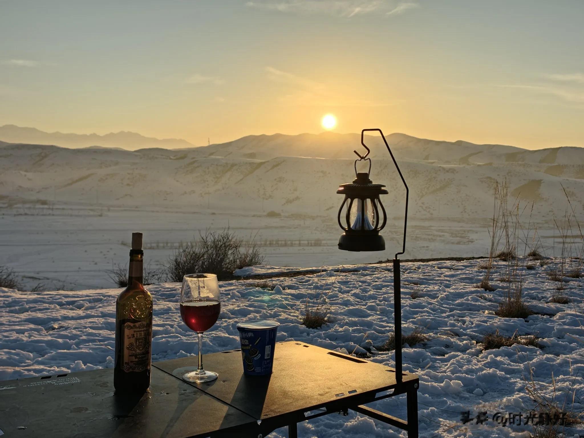 回到车跟前正好到了午饭时间,大家拿出自备的午餐,摆上桌椅,聚在一处,有说有笑分享美食。此刻的山脚下,没有一丝风,空气里带着暖洋洋的温度。抬眼望去,山坡上有马儿在雪地里散步、觅食,和我们一样,悠闲、惬意。