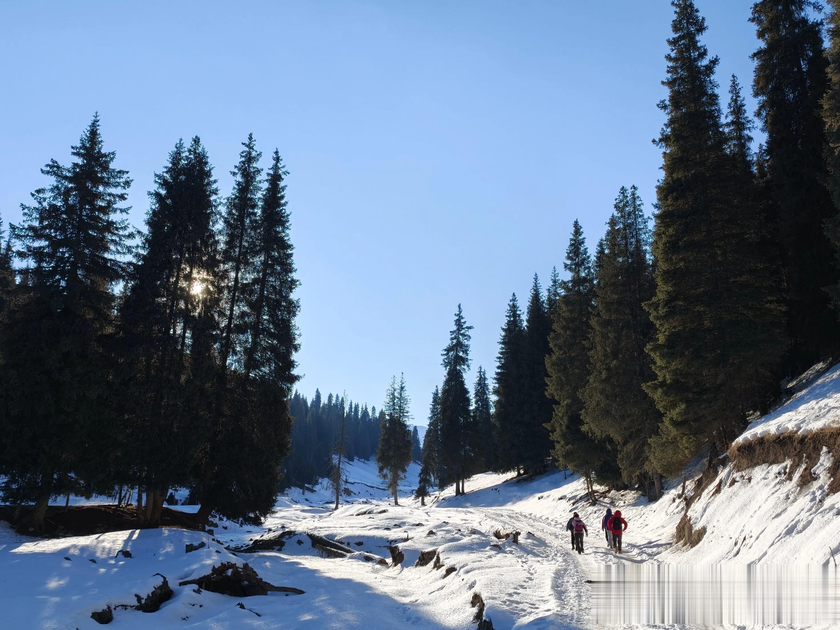 阳光穿过挺拔的青松洒向大地,天空湛蓝,群峰素裹,眼前的景象清晰而明朗。想起早上城区里灰暗的天空,重重的迷雾,不由地心生欢喜,庆幸我们逃离了那一片阴霾,来到这片净土享受灿烂的阳光。