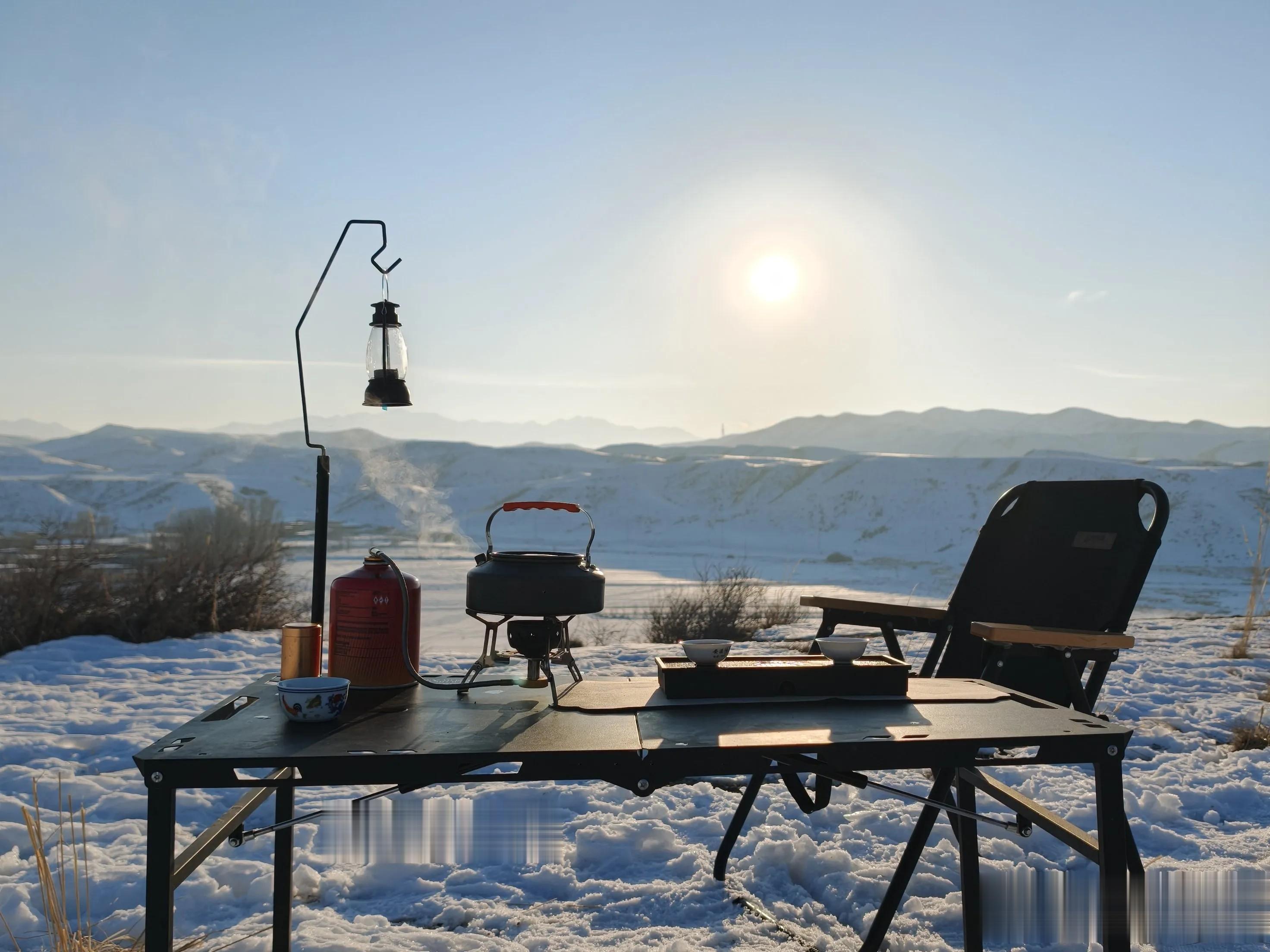 吃过午饭,原路返回途中拐进了黑家沟。爬上一个小土坡后眼前豁然开朗,一大片平坦的开阔地,一面是河谷,一面是山峦。生活情趣满满的小伙伴在雪地里支起桌椅,摆上茶台,烹水煮茶。水气袅袅、茶香氤氲,氛围感立时拉满。大家围炉品茶,闻暖香、忘寒凉,享受着这难得的轻松时刻。