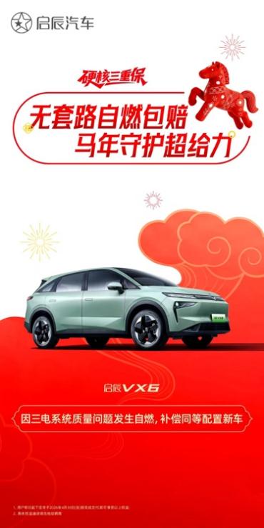 本次政策适用于启辰VX6(不含2026款启辰VX6长续航畅行版、标准续航畅行版)及启辰大V DD-i虎鲸车型,用户需在2026年3月1日至4月30日期间下订并完成交付即可享受。三电终身质保及自燃包赔具体细则,可参阅详细服务单或咨询当地经销商。