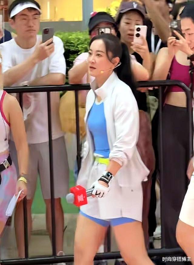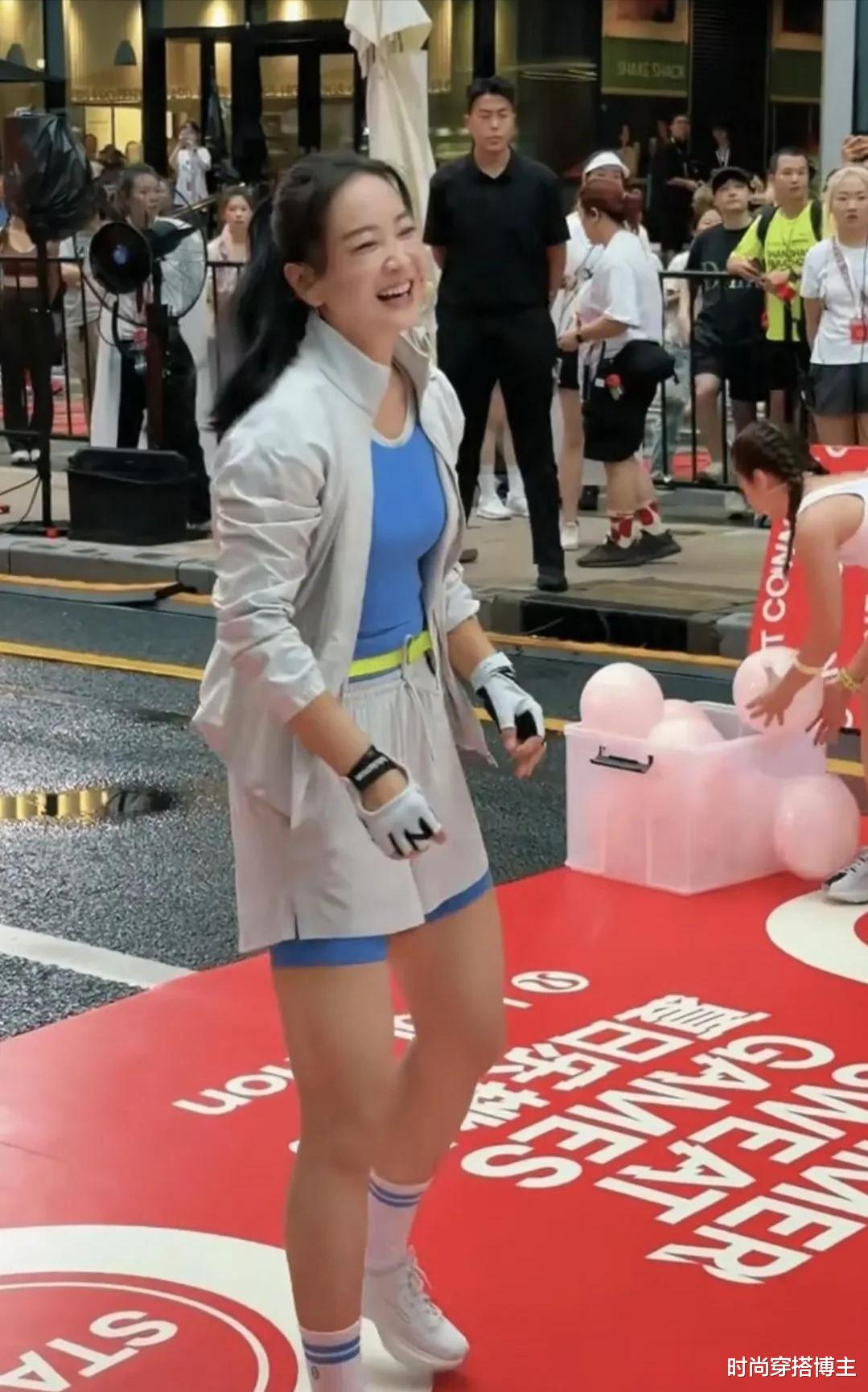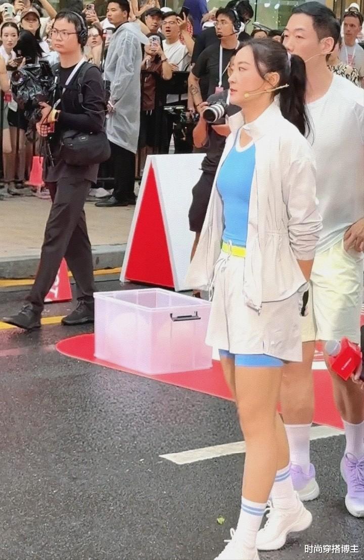从网友拍到的现场生图可以看出,贾玲穿着一身白色的宽松运动服,里面穿了一套蓝色紧身打底,随意扎了一个高马尾,短裤下露出不算纤细的大长腿,看着就挺有一股阳光运动美少女的既视感。