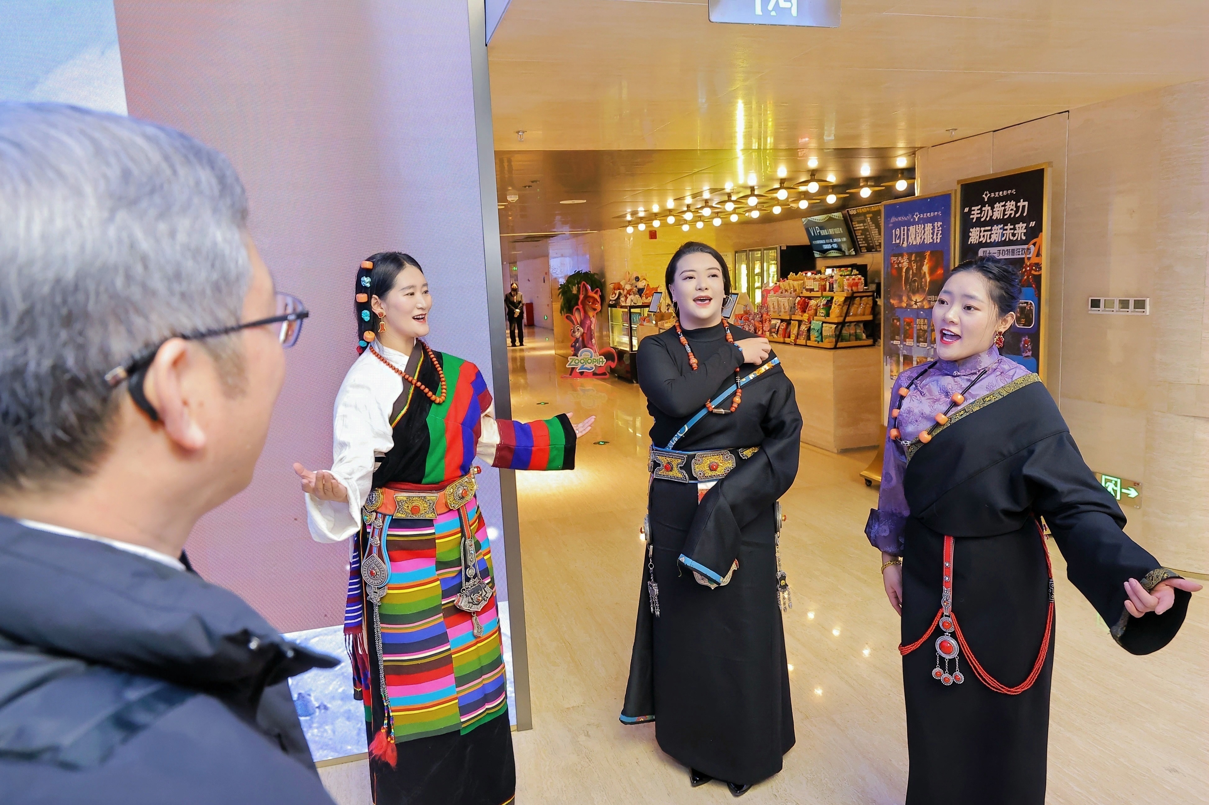 中央广播电视总台著名主持人朱迅进行了开场介绍:“刚才听到这样的歌声,我刚刚从西藏下来,我觉得我脚还没有沾地,我又回去了,阿里的风还在我的喉咙里。在这片被冰雪覆盖的世界里,他们用镜头书写着勇气与担当,创造了西藏电影史上的多个‘第一’。西藏电影第一次主投主控的献礼影片,开启了本土电影自主创作的新篇章。这是西藏人自己投的影片,这是非常了不起的。第一次以牦牛般坚韧不拔的精神,深入探索电影工业美学在高原环境下的独特表达。我觉得62天,在海拔5000米以上,甚至到达5800,这应该是电影行业首次吧,第一次以雄伟壮丽的西藏冰川为背景,展现其不为人知的魅力。”