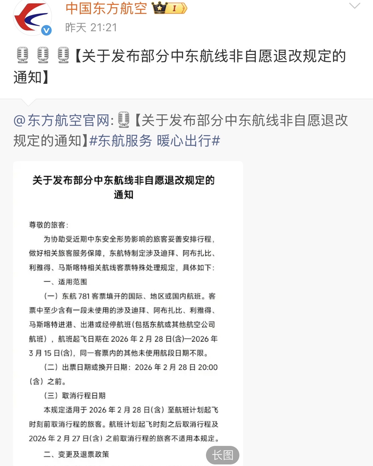 东航发布关于中东地区航班退改政策