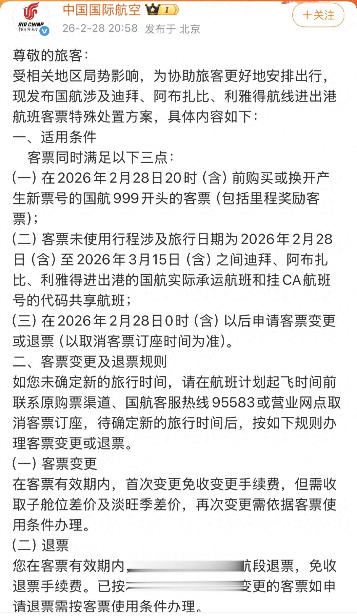 国航发布的“涉及迪拜、阿布扎比、利雅得航线客票特殊处置方案通知”显示,在2026年2月28日20时(含)前购买或换开产生新票号的国航客票,涉及旅行日期为2026年2月28日(含)至2026年3月15日(含)之间迪拜、阿布扎比、利雅得进出港的国航实际承运航班和挂CA航班号的代码共享航班可申请客票变更或退票。在客票有效期内,首次变更免收变更手续费,但需收取子舱位差价及淡旺季差价,再次变更需依据客票使用条件办理。
