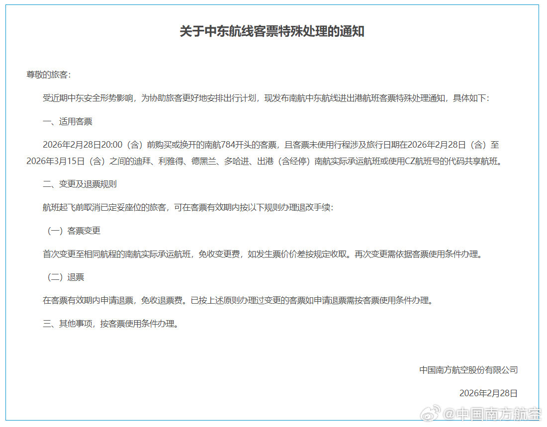 南航发布的“关于中东航线客票特殊处理的通知”中表示,2026年2月28日20:00(含)前购买或换开的南航784开头的客票,且客票未使用行程涉及旅行日期在2026年2月28日(含)至2026年3月15日(含)之间的迪拜、利雅得、德黑兰、多哈进、出港(含经停)南航实际承运航班或使用CZ航班号的代码共享航班,航班起飞前取消已定妥座位的旅客,可在客票有效期内按以下规则办理退改手续。首次变更至相同航程的南航实际承运航班,免收变更费,如发生票价价差按规定收取。再次变更需依据客票使用条件办理。在客票有效期内申请退票,免收退票费。已按上述原则办理过变更的客票如申请退票需按客票使用条件办理。