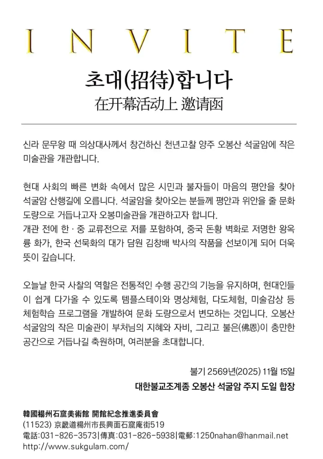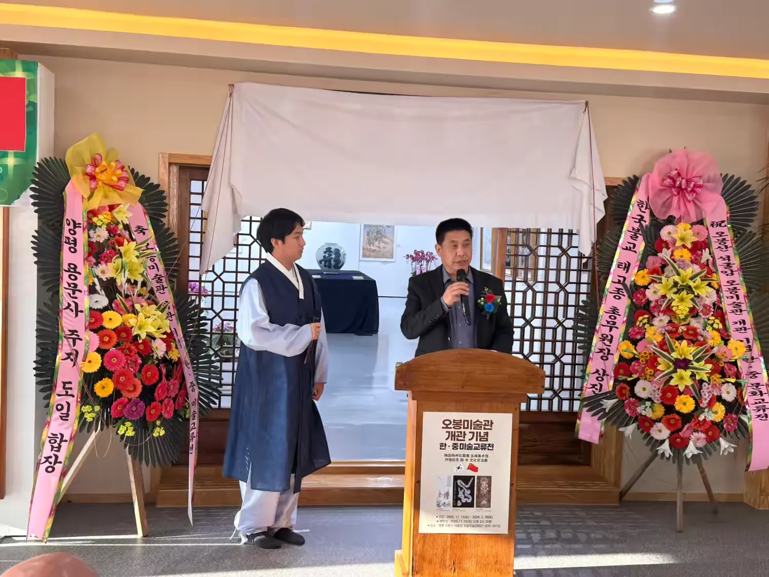 2025年11月15日 韩国杨州石窟庵 五峰美术馆今日正式开馆,首场“韩·中文化交流展”同期启幕,韩中两国艺术家、文化界人士及民众齐聚现场,共同见证这一文化盛事。