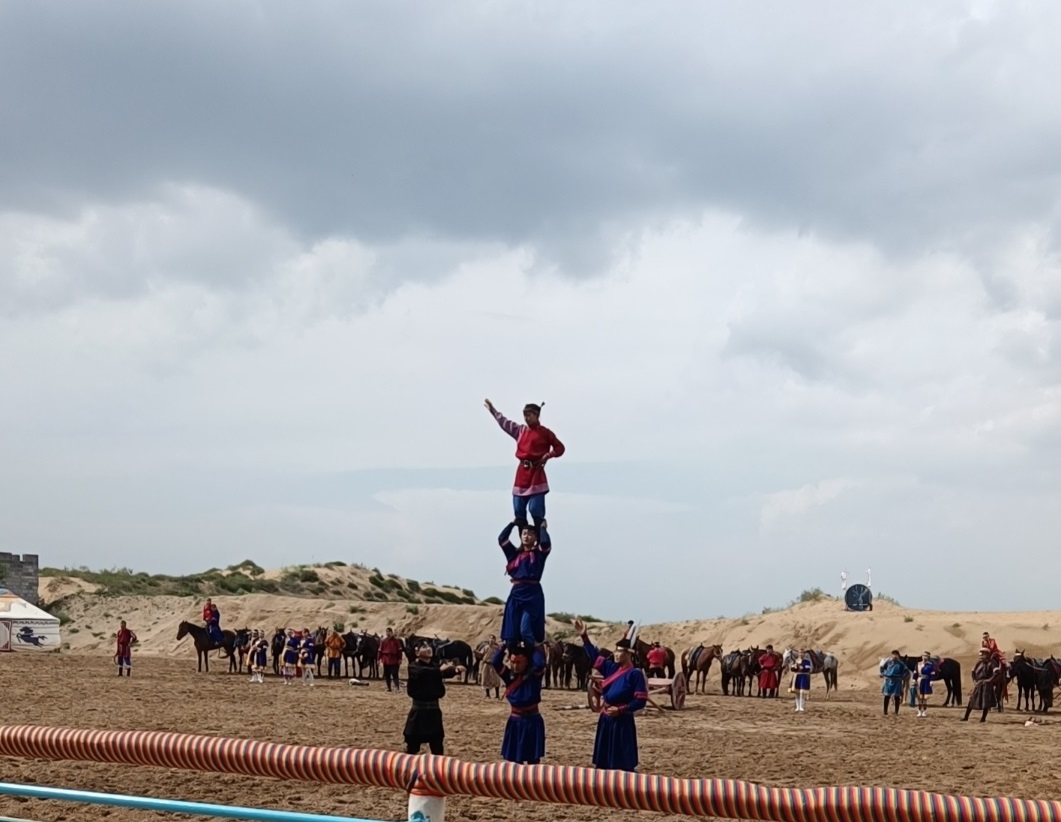 下了小火车,到达沙漠娱乐区域,有骑骆驼、射箭、冲浪、沙漠卡丁车、碰碰车、滑沙等项目,再往前行到达歌舞演出厅和马术表演区,马术表演是大型音乐剧,讲诉的是铁木真等蒙古英雄英勇奋战的故事,演员个个精神抖擞,马术精湛,几十匹马来回奔跑错落有致,场面鸿大十分震撼,弘扬了不为强敌保家卫国的民族精神,以及蒙古人民淳朴、勤劳、善良的精神美德。