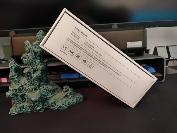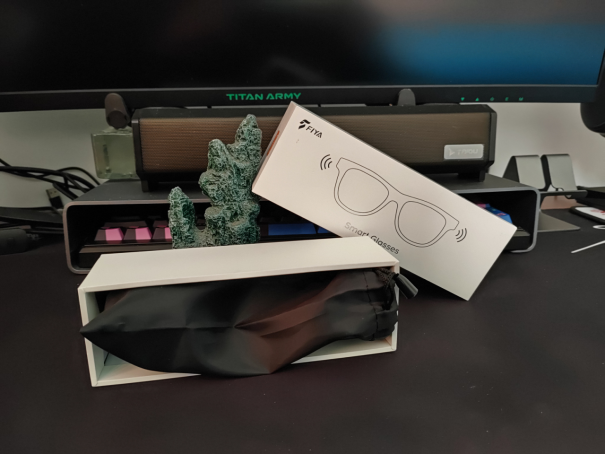 智能眼镜包装采用了天地盖的设计,起到很好的保护作用。厂家为产品标配了充电线、防滑脚垫、说明书,还附带了一个保护布袋和眼镜布等部件。