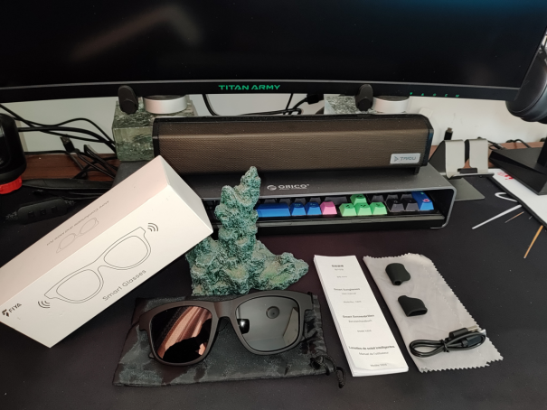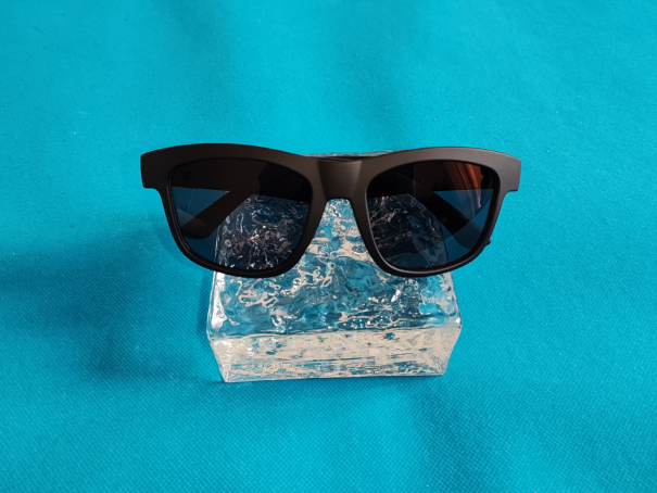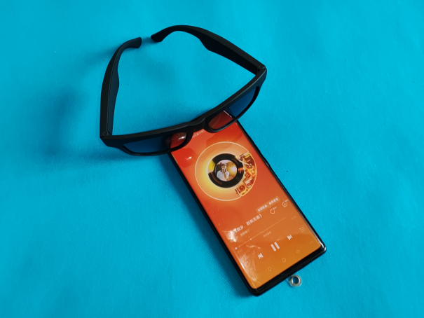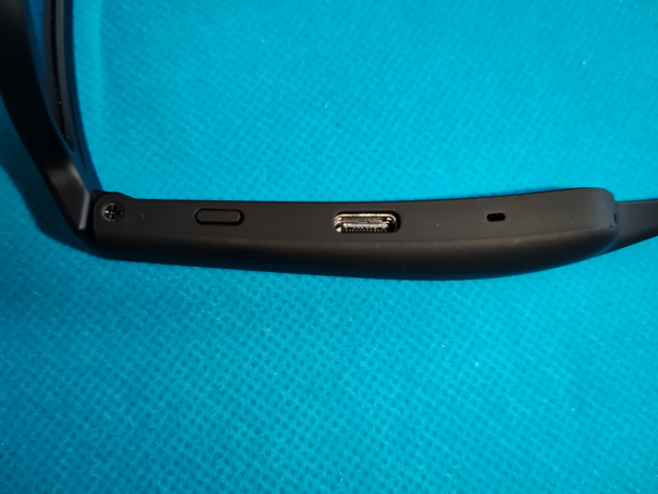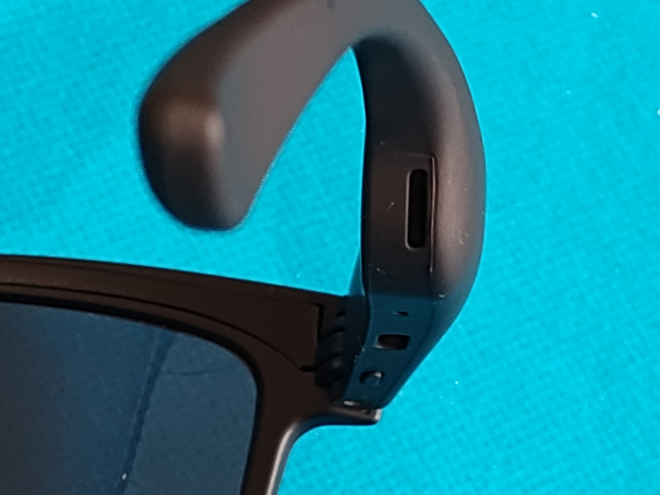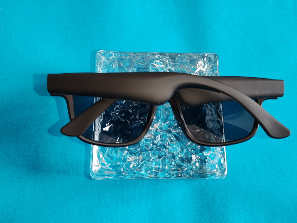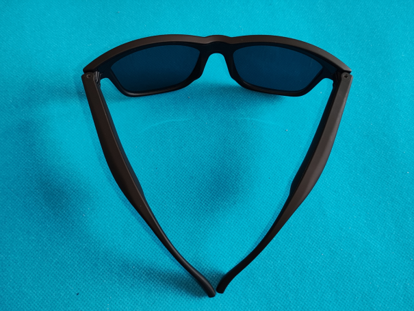 飞雅 FIYA F1智能眼镜最为与众不同的是在两侧支架中间位置,放置了下沉式外放,没有入耳的听筒部分,只是在与耳道靠近的位置留出了出音的开槽,可以使耳机发出的声音直接传入耳朵里。