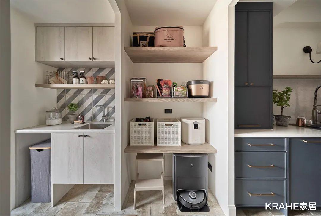 从烹饪区拉出一条走廊,拆除原来的隔间墙,整合了食物储藏室、洗衣区,一直延伸到后面的阳台,让杂乱的动线统一起来,流畅自然。