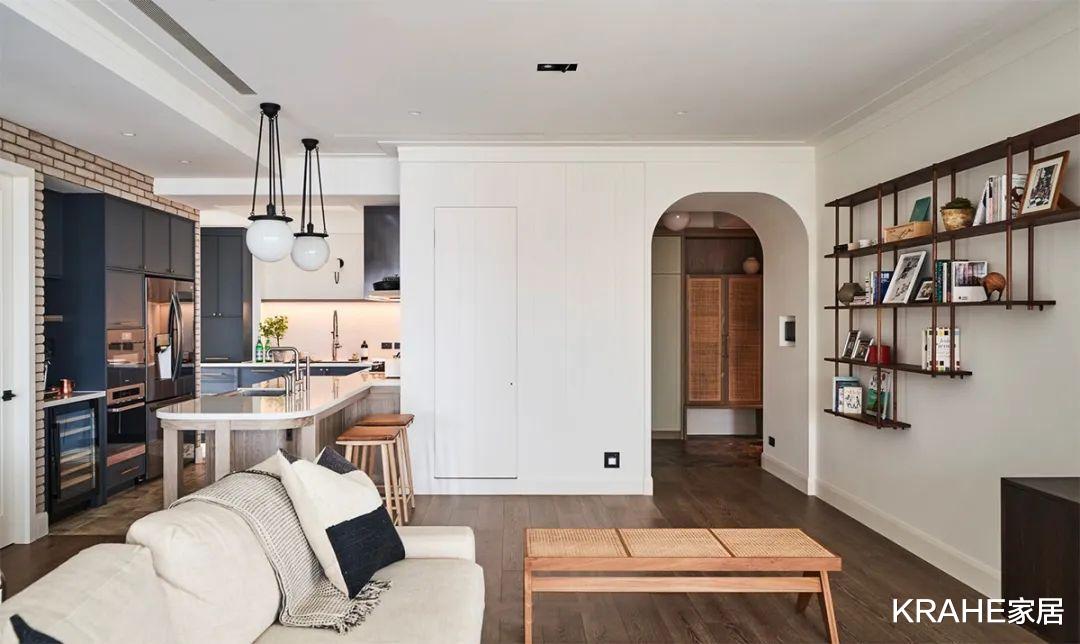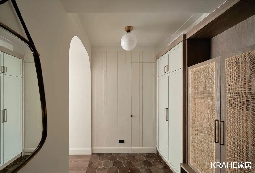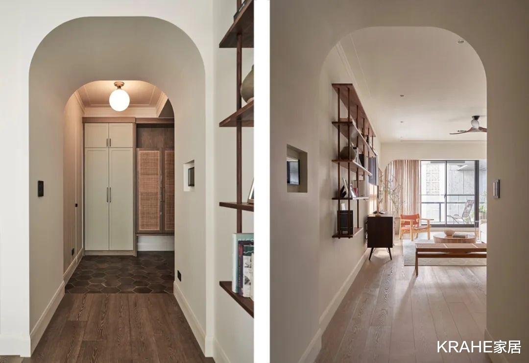 引入圆弧元素,形成拱顶门框,连接玄关和公共区域。玄关即使未装饰,也展现出高效能的落尘区,与公共区域的材质相呼应。