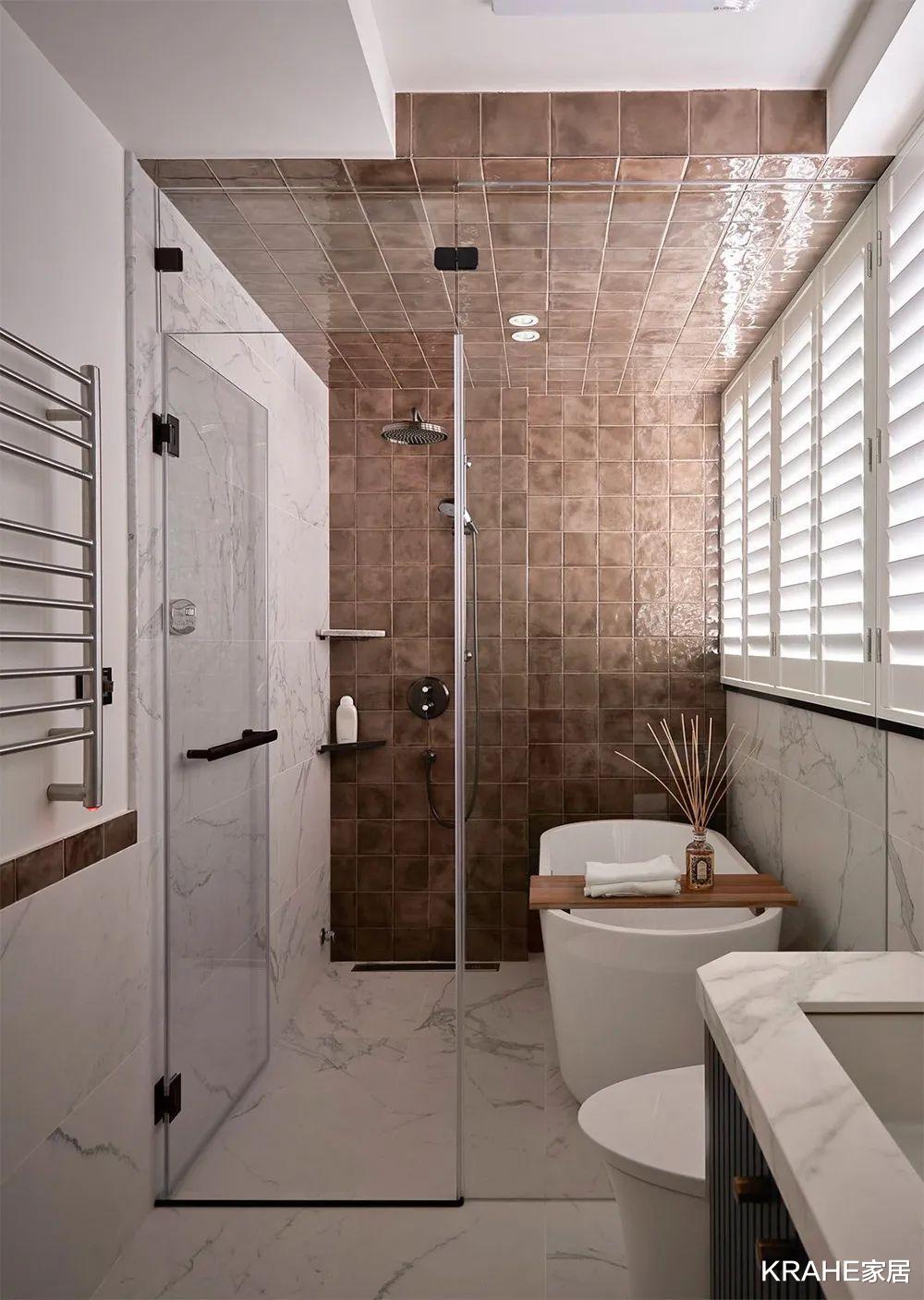 主浴室原本是建商的布局,现在改造成了一个家庭桑拿室。天花板和墙壁都贴上了棕色磁砖,通过色彩的对比增加了空间的张力。