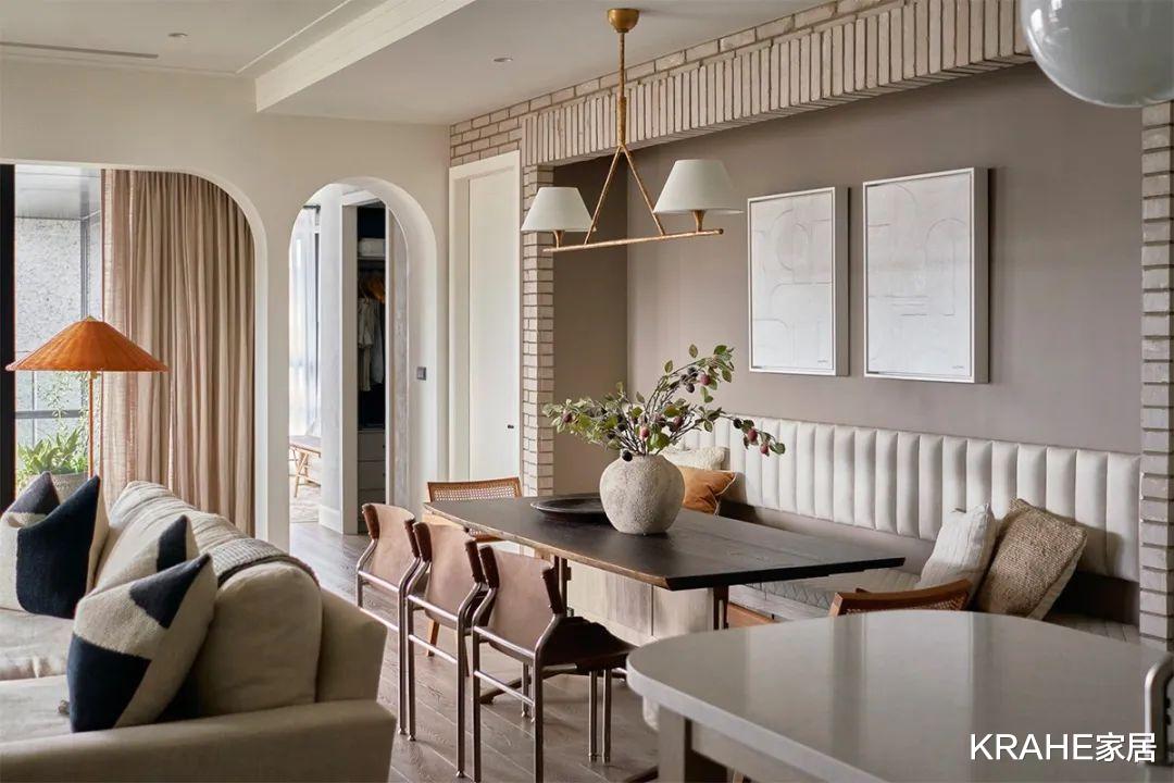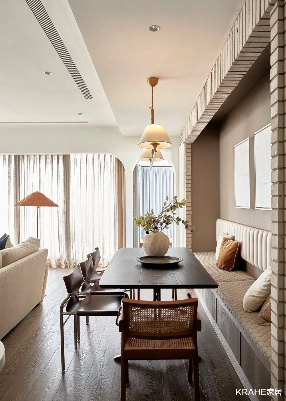 专业的软装设计,善于运用多种元素碰撞,保持平衡感。例如,餐桌使用皮革椅、金属脚、实木纹理桌、藤编主人椅,甚至引入多种装饰性灯饰。