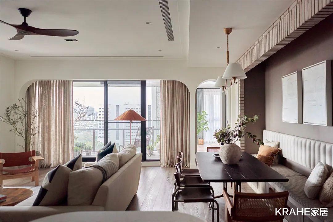 窗框采用柔弧设计,与整个房间的弧线相呼应。为了使观影角度更佳,选择了高的台面,使餐厅也能享有绝佳视角。