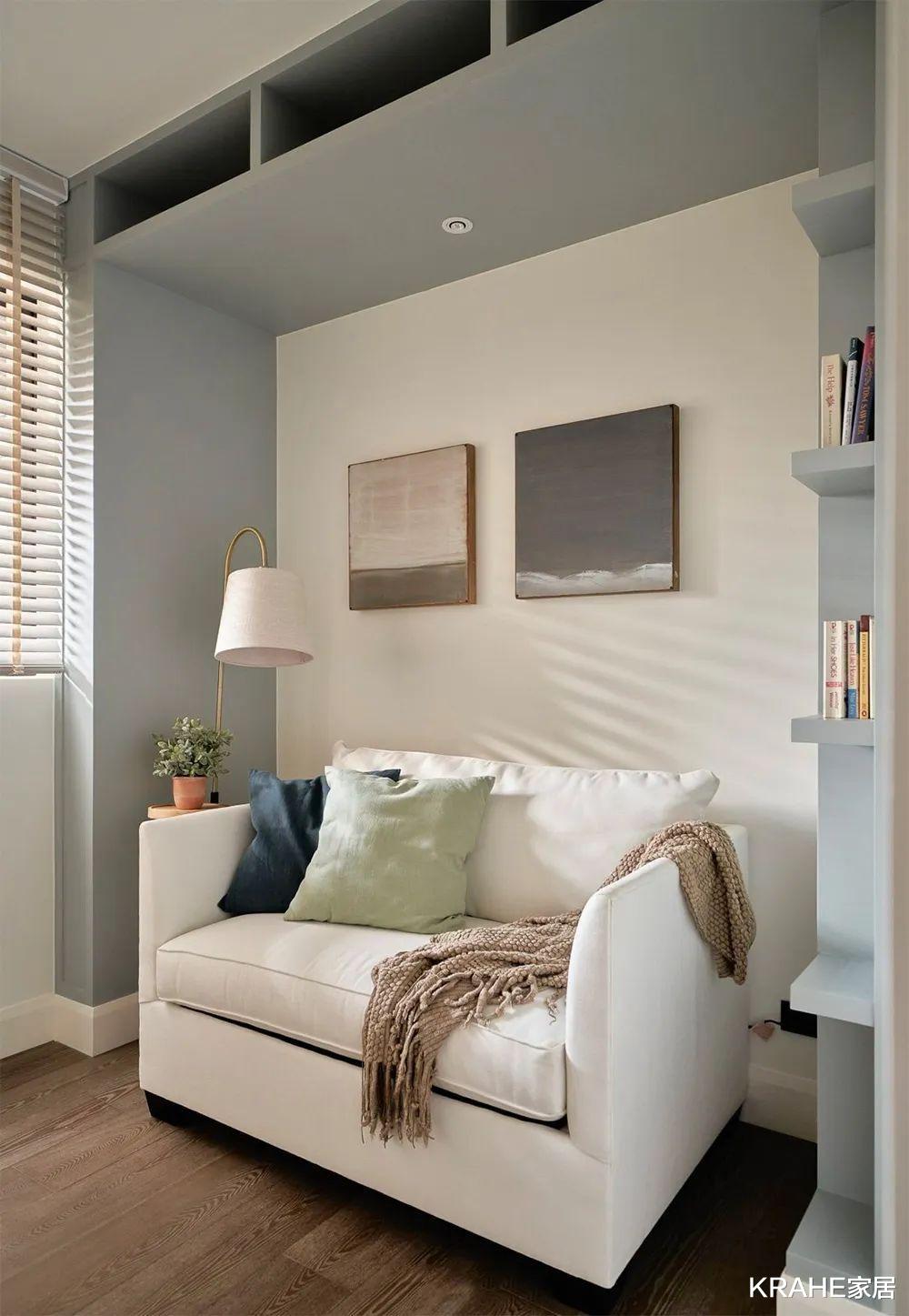 在主卧的一侧,开辟了一个字型更衣室,因为隔间墙的遮挡,室内昏暗无光,于是打开了一扇高窗,让阳光得以涌入。