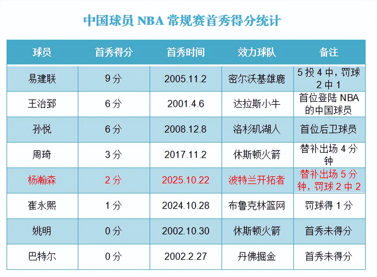 2025年10月22日,2025-2026NBA常规赛首轮中,波特兰开拓者对阵明尼苏达森林狼,20岁的杨瀚森替补出场,首秀5分钟,其中罚球2罚2中,得到2分。