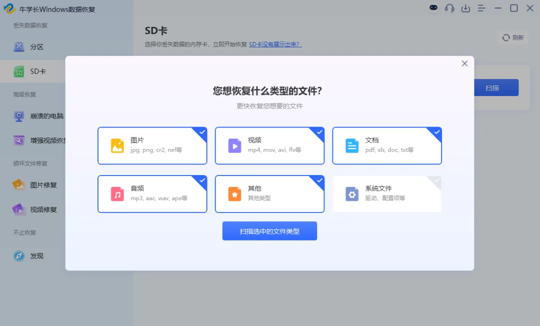 2、选择位置后,系统会弹窗让您继续选择需要恢复的数据类型,然后点击 “扫描选中的文件类型” 按钮,软件开始扫描磁盘,这个过程可能需要一些时间,取决于磁盘的大小和扫描的深度。