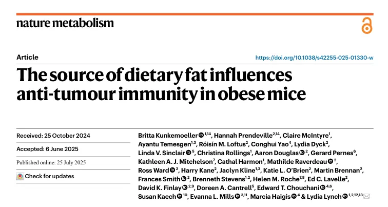 [1]Kunkemoeller B, Prendeville H, McIntyre C, et al. The source of dietary fat influences anti-tumour immunity in obese mice. Nat Metab. 2025 Aug;7(8):1630-1645. Doi: 10.1038/s42255-025-01330-w.