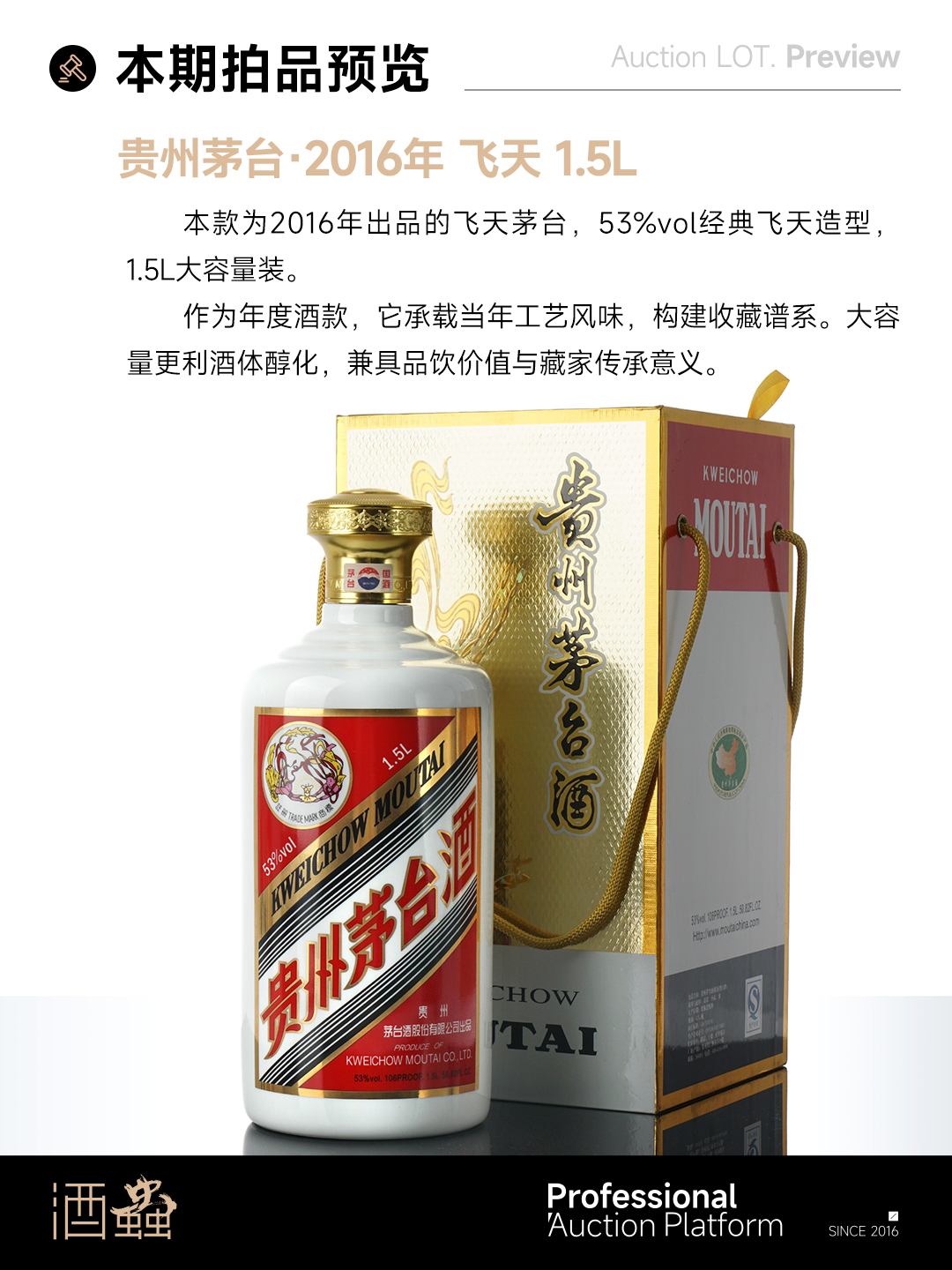 酒款介绍:本款为2016年出品的飞天茅台,53%vol经典飞天造型,1.5L大容量装。作为年度酒款,它承载当年工艺风味,构建收藏谱系。大容量更利酒体醇化,兼具品饮价值与藏家传承意义。