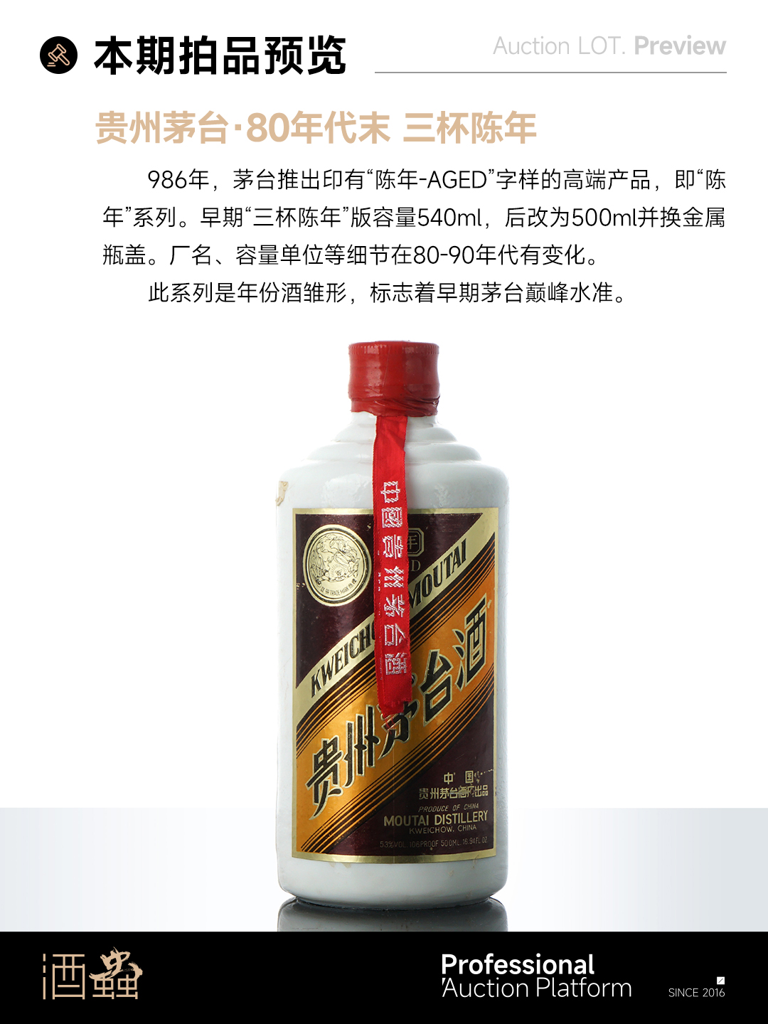 酒款介绍:1986年,茅台推出印有“陈年-AGED”字样的高端产品,即“陈年”系列。早期“三杯陈年”版容量540ml,后改为500ml并换金属瓶盖。厂名、容量单位等细节在80-90年代有变化。此系列是年份酒雏形,标志着早期茅台巅峰水准。