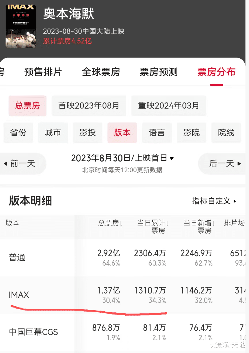 而诺兰上一部《奥本海默》,国内IMAX票房占比30.4%,说明观众相当热衷于选择在IMAX厅看诺兰的电影。