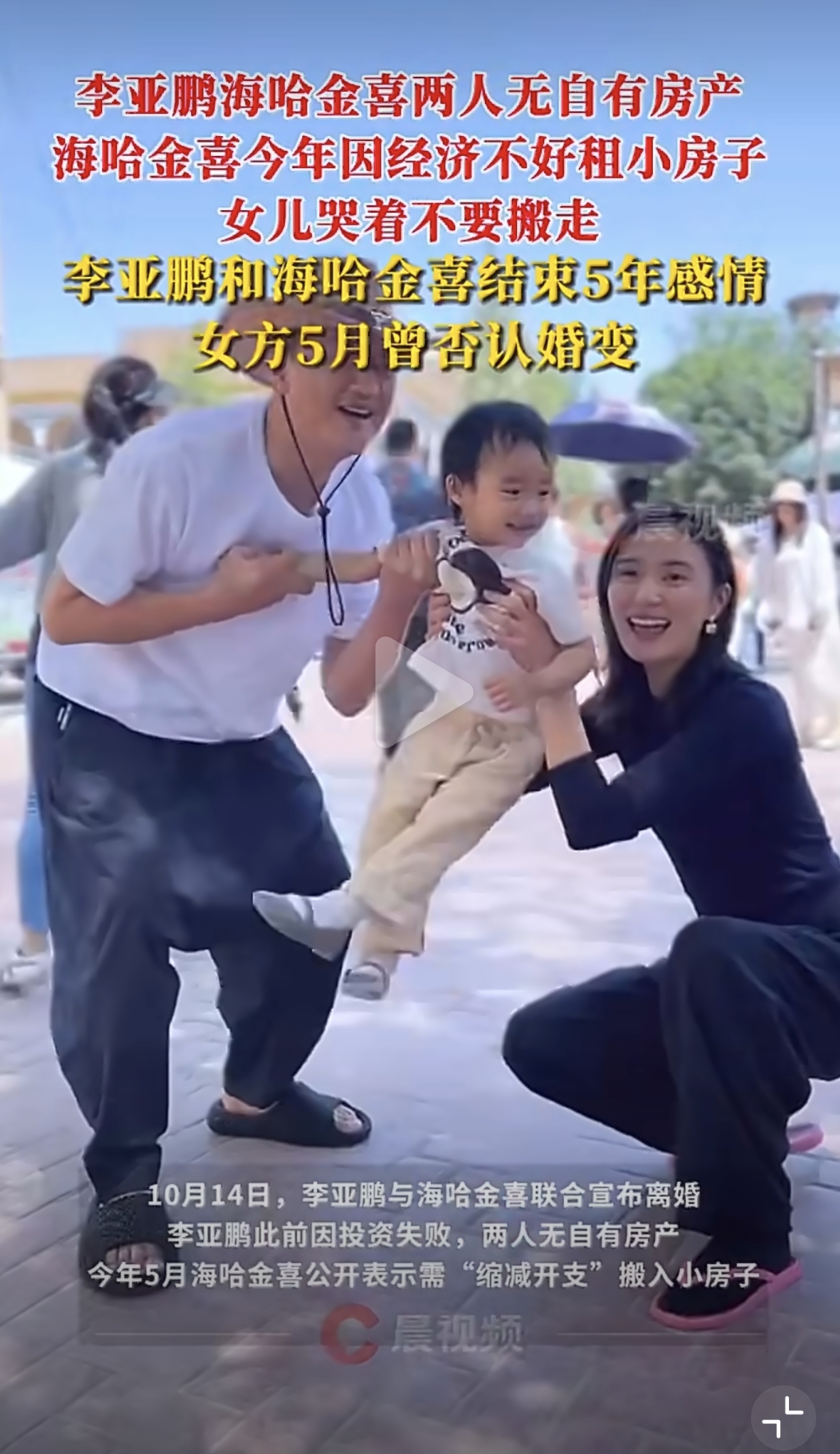 回顾两人的婚姻历程,2020年,李亚鹏与比他小19岁的模特海哈金喜恋情曝光;2022年3月,两人登记结婚;同年女儿出生。这段婚姻仅维持了不到两年时间,令不少人感到惋惜。