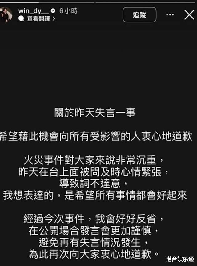 对此,詹天文迅速采取行动。她在Instagram发表限时动态对受灾市民道歉,透露当时在台上因为过于紧张,导致口误、词不达意,其实真正想要表达的是希望所有事情好起来。