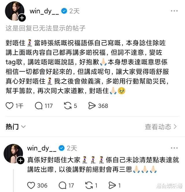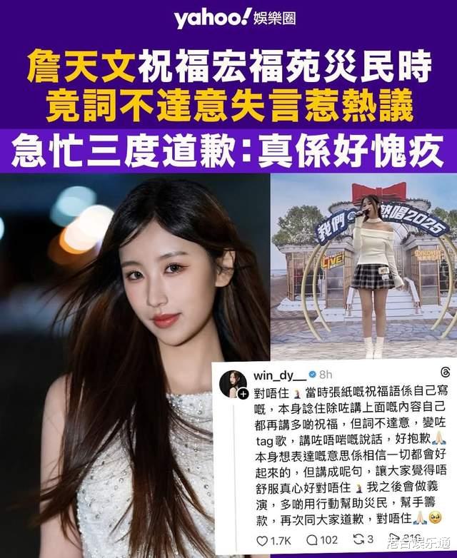 数小时后,詹天文在Threads发文再度道歉,并晒出当时的手写卡片,就口误风波做出解释,还承诺会参加义演、帮助筹款,用实际行动帮助灾民。但这种方法仍未能平息批评浪潮,多数高赞评论仍是对她的批评。