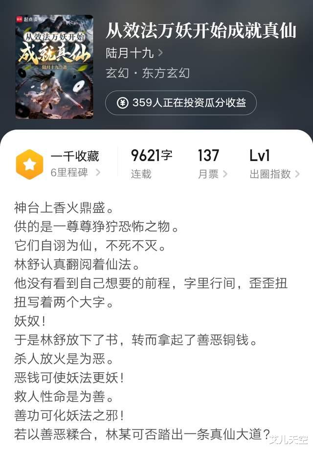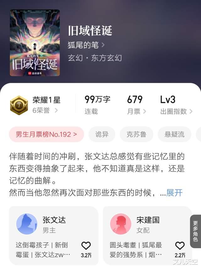 陆月十九凭借上本小说《从斩妖除魔开始长生不死》拿到了2024年的十二天王荣誉,小说在完结后也升到了十万订成绩。时隔九个月,再开新书,看未来表现如何吧。