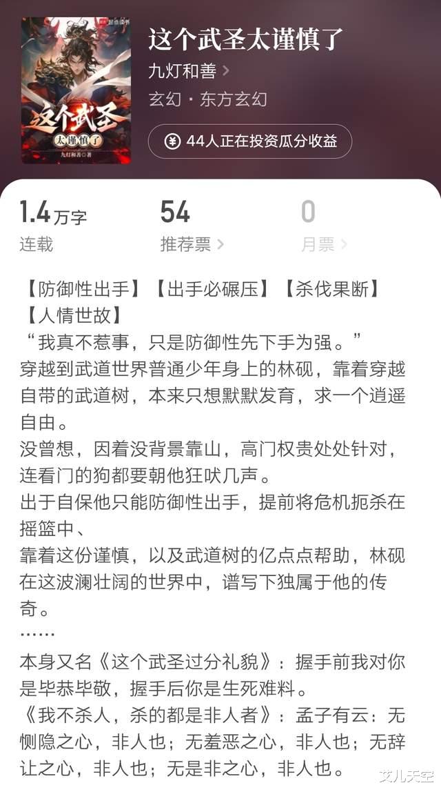 大神九灯和善的新书《这个武圣太谨慎了》昨天开的,他上本武道文去年十二月完结的,大精品成绩。这次隔了四个月准备了上百章存稿,开了新书。