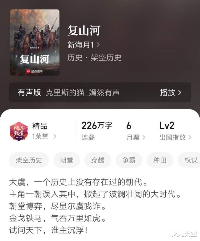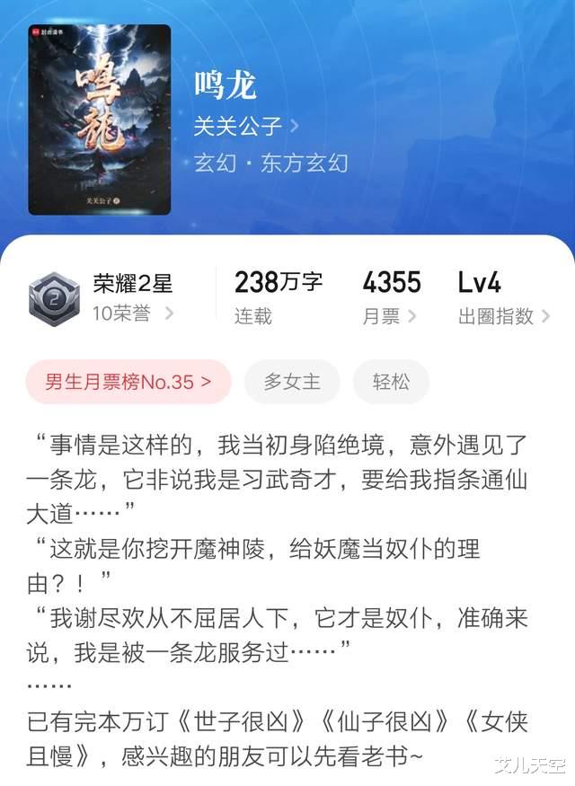 这期还是说点作品完结,作者开书的消息,大神关关公子的《鸣龙》今天刚完结了,昨天说到新海月开新书的消息,今天断更老书《复山河》就完结了。