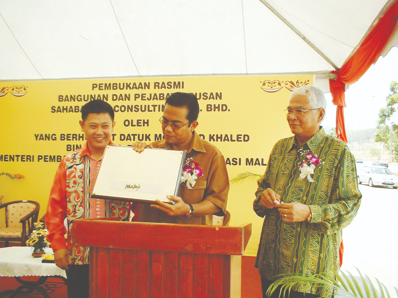 由时任大马企业与合作社发展部长拿督斯里莫哈末卡立诺丁 (现任大马国防部长)主持开幕。拿督李治荣上校 ,沙赫巴执行董事(左)和时任主席拿督拉欣蓝利博士, 柔佛州宫廷理事会主席(右) 陪同。