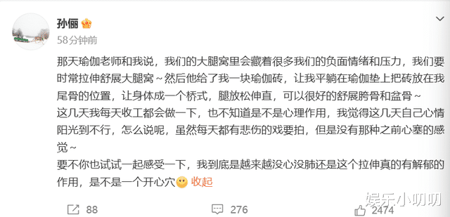 孙俪还称这是开心穴,诚邀大家一起感受一下,看看最近的开心是自己越来越没心没肺了还是这个拉伸真的有解郁的效果。孙俪近期个人社交平台的动态很多,全是分享自己生活和感悟的,这种状态真的超级好,能完全感受到孙俪对生活的热爱。进组前自己调制精油,拍戏过程中还能坚持瑜伽动作,真的好自律!