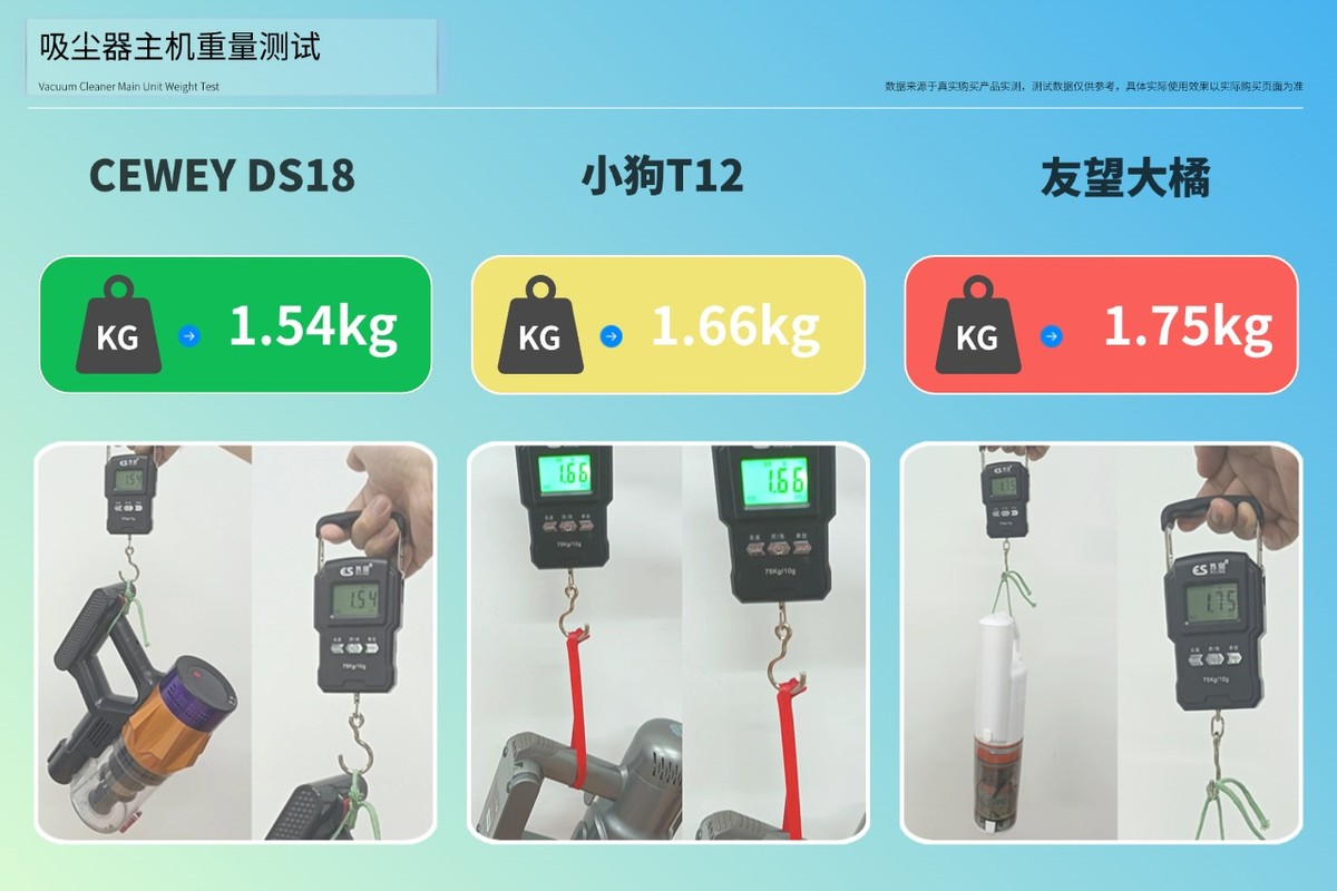 测试方法:把每台吸尘器的主机拆下来,用电子秤精确称重。为了公平,测试前都保证尘杯是空的、电池已经装在主机里,然后再称重记录数据。