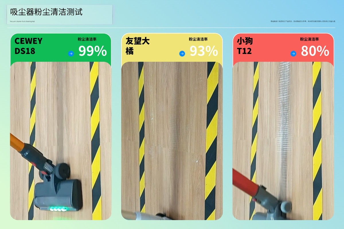 测试方法:我们在木地板上均匀撒上面粉,然后每台吸尘器使用标准吸力档位,匀速推扫一次,观察清扫后的地面是否明显残留粉末。