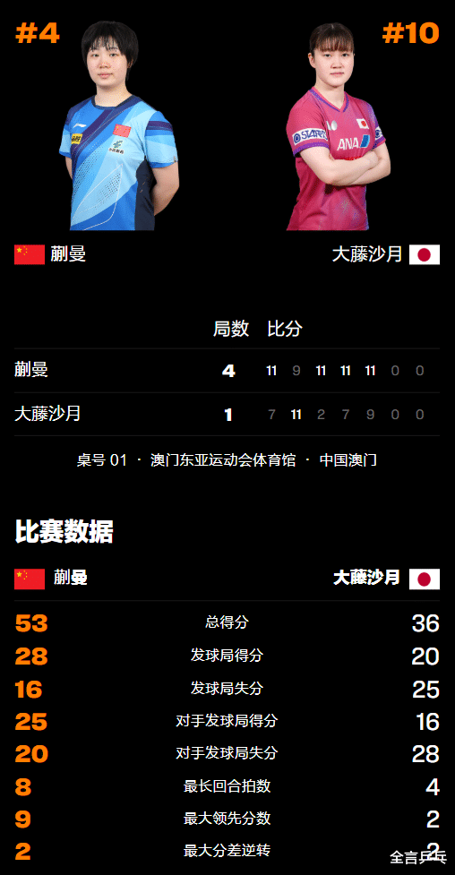 第三局蒯曼迅速找回状态,上来就打出了一波8-0的小高潮,完全将大藤沙月的防线拉穿,被追回1分后继续赢球,随后10-2领先没有错失局点,最终以11-2轻松取得胜利。