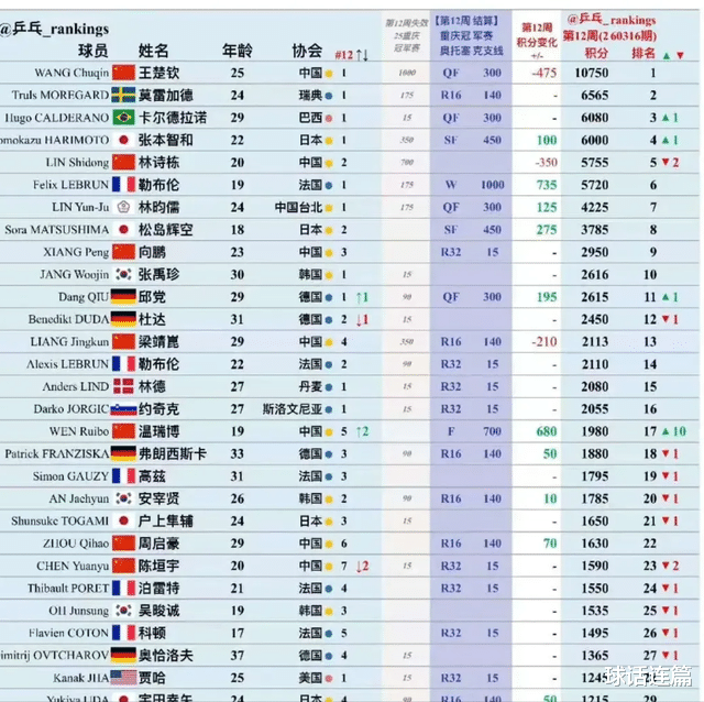 至于本站夺冠的法国选手小勒布伦,积分有735分进账,总积分来到了5720分,依旧稳居世界第六的位置,小勒布伦距离林诗栋总共只有35分的差距。接下去的澳门世界杯,小勒布伦随时有反超的机会,就看林诗栋能否顶住压力,打破长达1年的单打冠军荒。除此之外,林昀儒和松岛辉空的积分也有相应的提升,整体排名则保持不变,只有林诗栋,雨果和张本智和三人换位。八强赛惨遭温瑞博爆冷的德国选手邱党,积分也有195分入账,排名因此上升到了11分,反超了队友杜达。重点要说的莫过于温瑞博,自从今年各项大赛开打以来,温瑞博的排名就一直在飙升,此番夺得亚军后,温瑞博的排名直接杀进了前20。