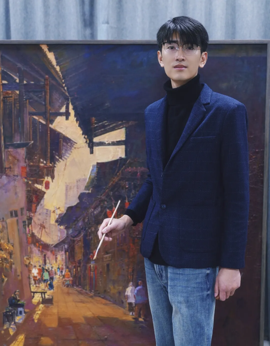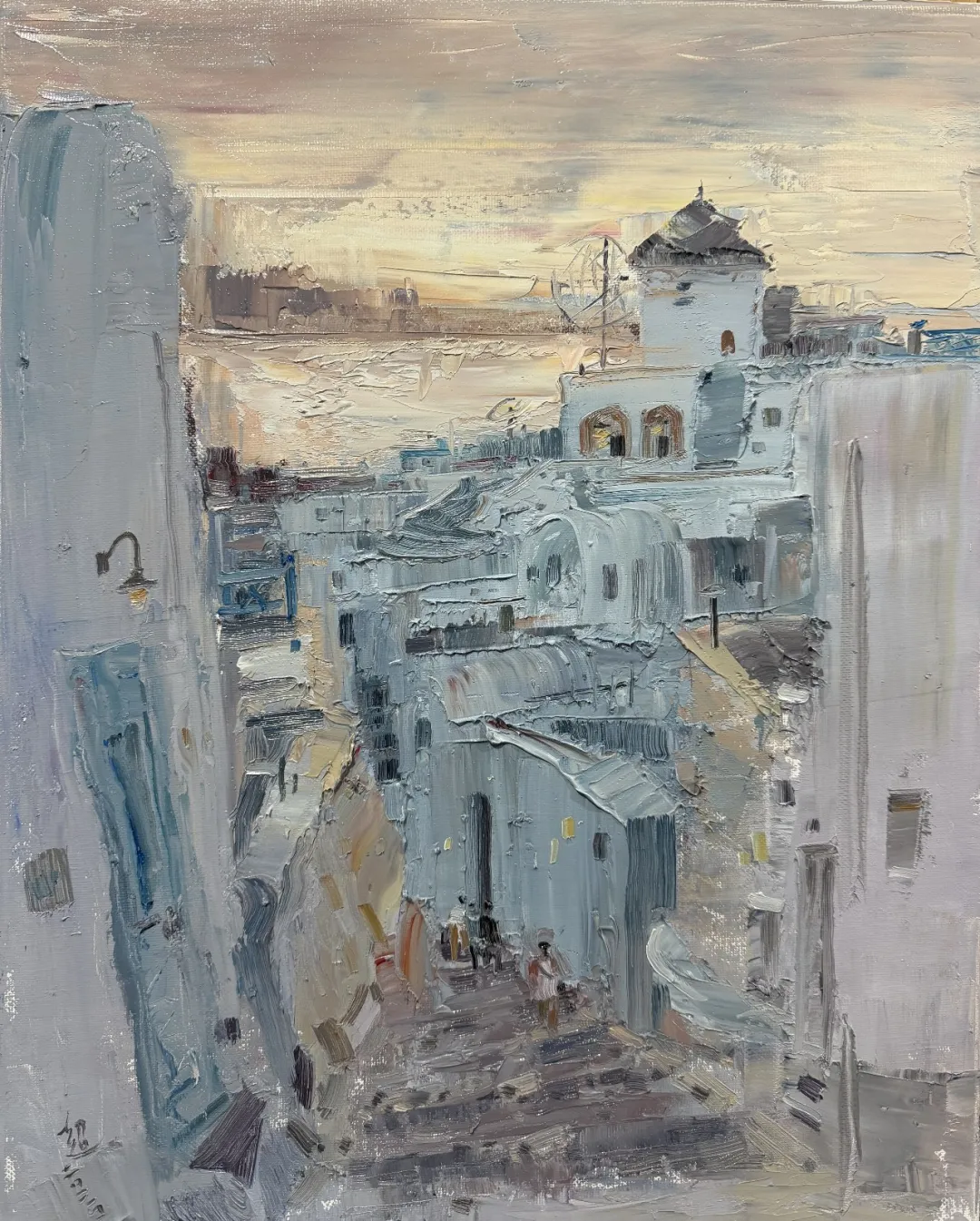 工作远离家乡后,故乡成了我心中永恒的牵挂。无论欢喜忧愁,故乡的记忆总如潮水般涌来。在城市的喧嚣中,我穿梭于古街之间,那斑驳的墙垣、古朴的门窗,仿佛是故乡派来的使者,勾起我往昔的点点滴滴。我常常在想,梵高在远离故乡的地方,是否也如我这般,将对故乡的思念化作笔下那热烈而奔放的色彩?终于,我找到了创作的归宿——乡愁。我以古村古街为蓝本,用画笔勾勒心中的故乡。我不断探索,确立独特创作理念。古街古村是城市文化的瑰宝,沉淀着岁月记忆与文明精华,是我取之不尽的灵感源泉。色彩上,我萃取古街元素,构建和谐色调体系,暖色调与明暗对比营造出温馨沧桑的氛围,引领观者穿越时空,感受历史人文。几何抽象手法将建筑简化为形体,组合排列成富有秩序感的画面,实现写实与抽象的统一。笔触则是我情感的桥梁,随心情豪放或细腻,赋予作品生命力,传递我对古街古村的深深眷恋。