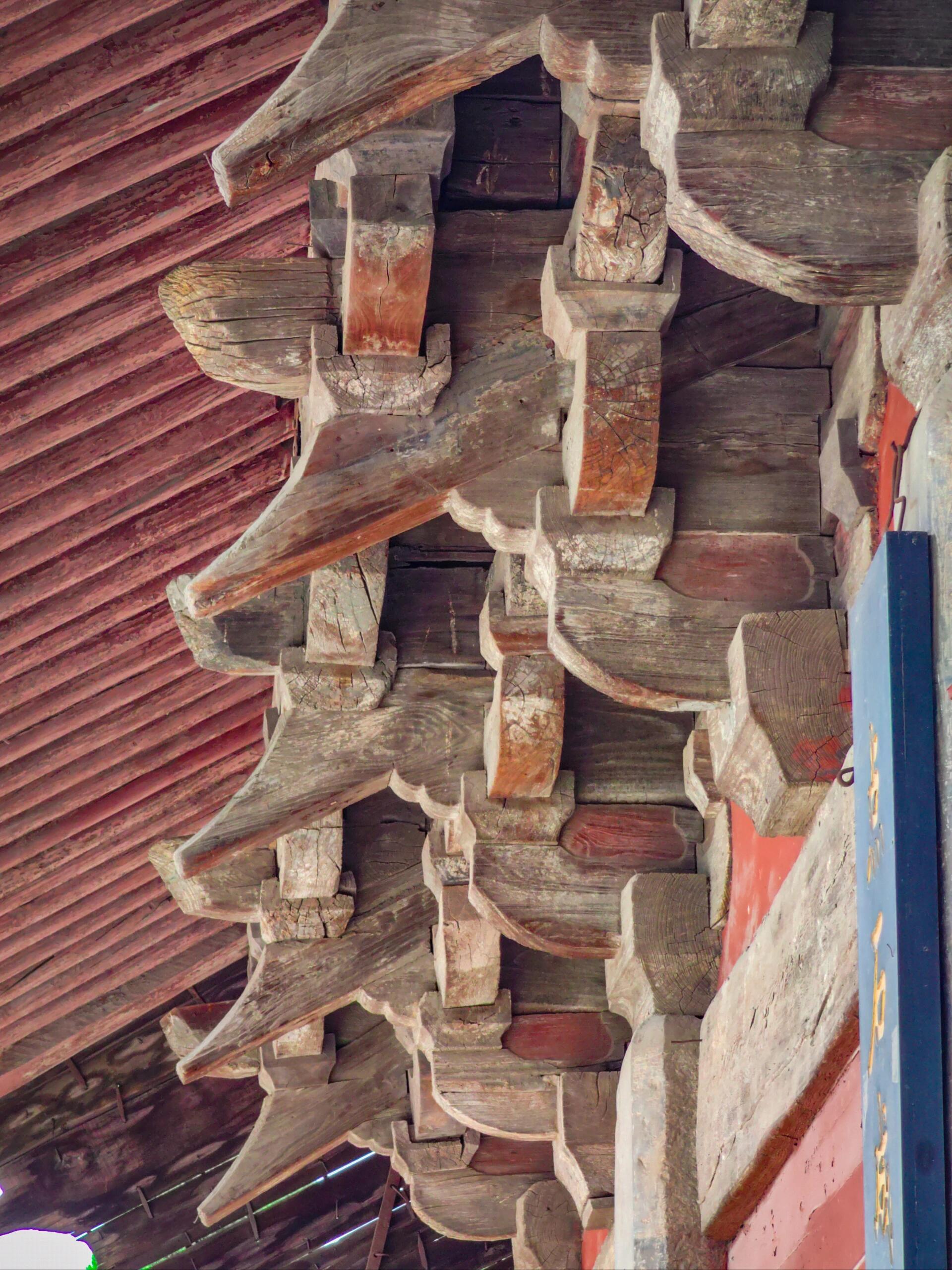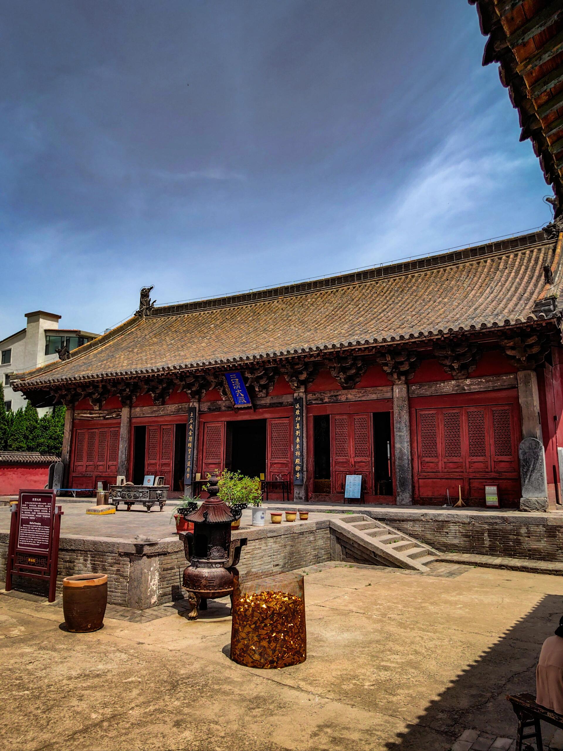 金代的建筑风格在三清大殿上体现得淋漓尽致。不同于唐代建筑的雄浑大气,也不同于明清建筑的华丽繁复,金代建筑融合了宋辽建筑的特点,既有细腻的装饰,又不失豪放的气质。大殿的屋檐微微上翘,线条流畅自然,给人一种灵动之感。斗拱的设计也十分精美,层层叠加,错落有致,不仅起到了承重的作用,更是极具观赏性。那些雕刻在梁枋、斗拱上的花纹、图案,虽然经过岁月的侵蚀有些已经模糊不清,但依然能看出当年工匠们精湛的技艺。