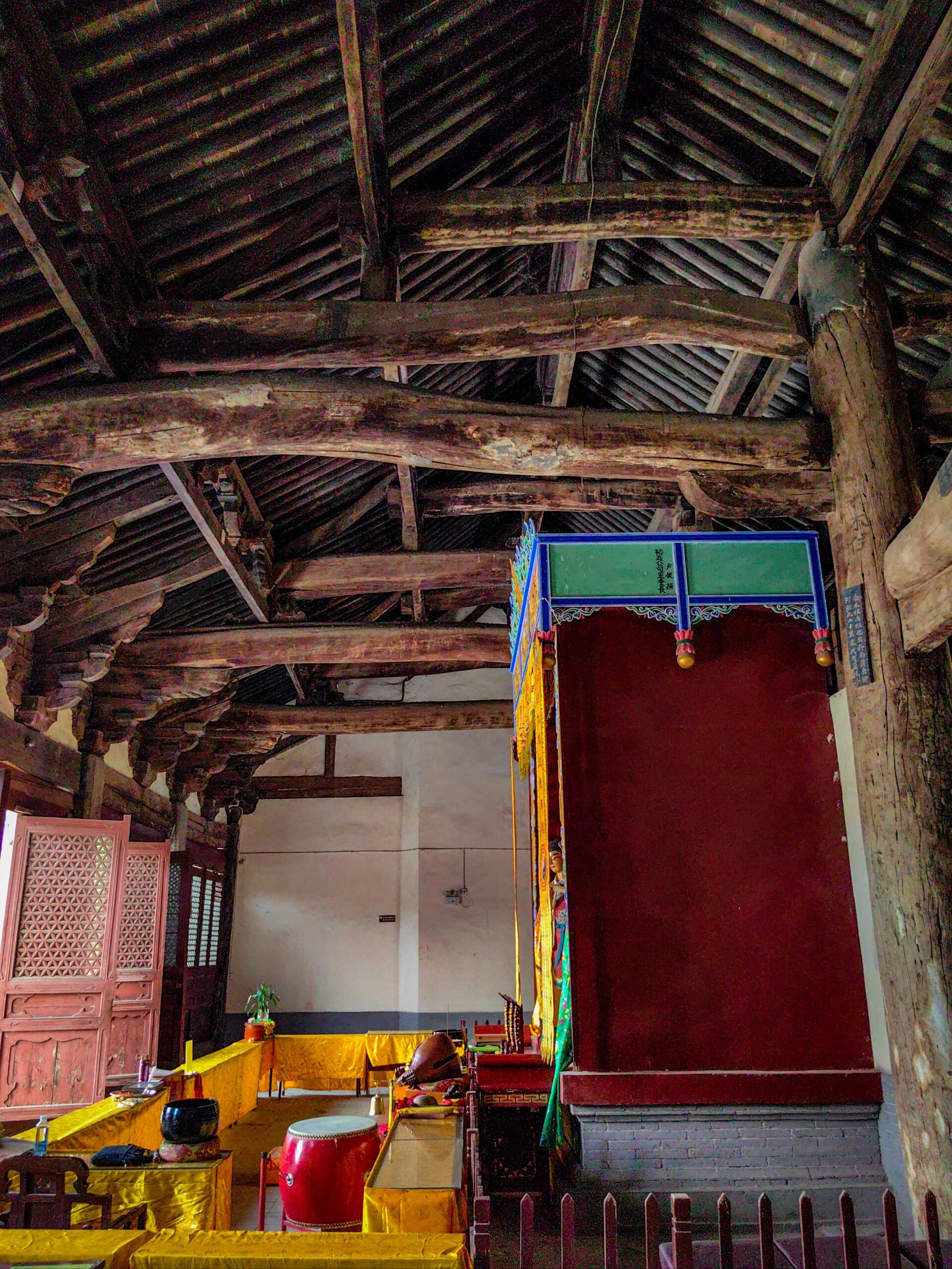 当你走进三清大殿,首先会被其宏大的空间所震撼。没有了密密麻麻的立柱阻挡视线,整个大殿显得格外宽敞明亮。抬头望去,殿内的梁架结构精妙绝伦,纵横交错的木梁相互支撑,形成了稳固而又美观的架构。这些木梁,每一根都有着独特的形状和尺寸,它们相互配合,共同承担着大殿的重量。工匠们在建造时,巧妙地运用力学原理,将减柱后的力学问题一一解决,使得大殿历经数百年的风雨依然屹立不倒。