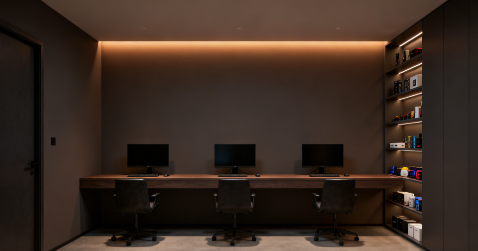 程序员夫妇B和C,将次卧彻底改造成了双人游戏室。双人位大书桌、整面墙的开放式书架收纳游戏和设备,墙面采用深色降噪材料,搭配线性灯带,氛围感拉满。
