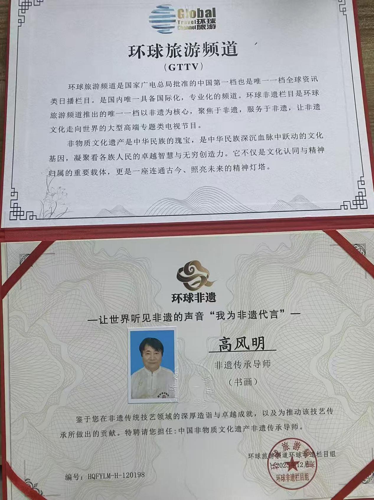 高风明1956生于河南省开封市尉氏县,岗李乡,水砦高村。现化归为郑州航空港区定居。自幼有三大爱好,第一爱好书画,展示书画天赋,现任中华炎黄书画研究院理事。2025年12月环球旅游电视台颁发非遗传承导师证书。2026年2月受邀参加中央广播电视台中国书画春晚《江山如此多娇》颁奖盛典全国名家邀请展!