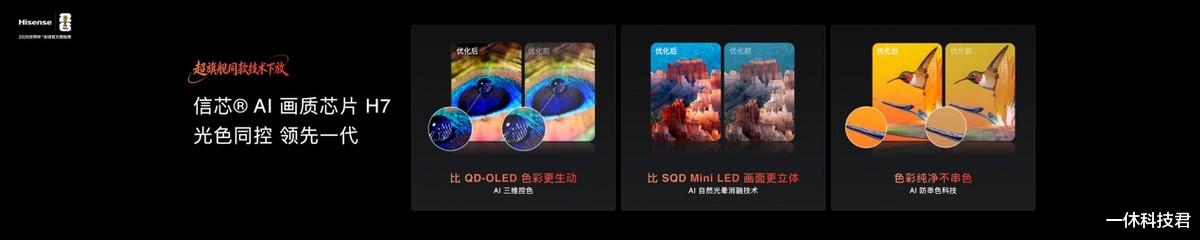 信芯AI画质芯片H7是驾驭RGB-Mini LED技术的超强大脑,作为海信E7S Pro额外搭载的独立高算力画质芯片,与普通电视的基础显示芯片形成代际差距,堪称电视界的“5090级独显”。信芯H7以108bits超高控色精度实现像素级光色同控,可独立指挥红、绿、蓝三路光源的亮度与色彩调节,而传统单色背光技术仅能实现简单的亮暗控制。依托信芯H7的AI防串色科技与AI自然光晕消除算法,芯片可毫秒级侦测画面色彩边界,智能抑制色光干扰,让光晕消融至人眼不易感知的程度,实现“以色制光”的极致效果。同时,信芯H7搭载的AI超清晰解构Pro技术,可将2K、1080P信号逐帧重构为接近4K的超高清画质,AI人眼景深追焦技术还能智能识别画面主体,强化细节、柔化背景,让观影沉浸感大幅提升。